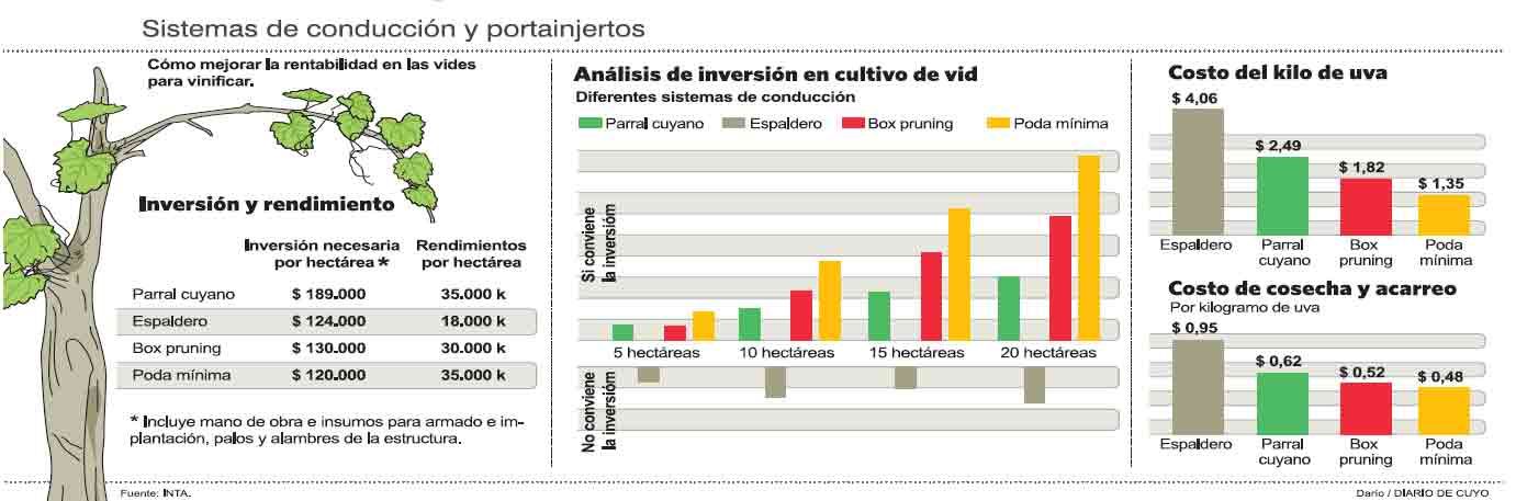 Continuamos en la búsqueda de bajar costos y de ayudar al productor. Una de las recomendaciones para mejorar la rentabilidad en el sector vitivinícola está basada en el sistema de conducción. Raúl Novello, economista del INTA San Juan, comparó dentro de los que se dedican a vinificar, el parral cuyano, que ronda 35.000 kilos por hectárea, el espaldero de 18.000, el box pruning (llamado poda en seto, o también poda en caja) de 30.000 y el de poda mínima, que también da 35.000 kilos por hectárea.