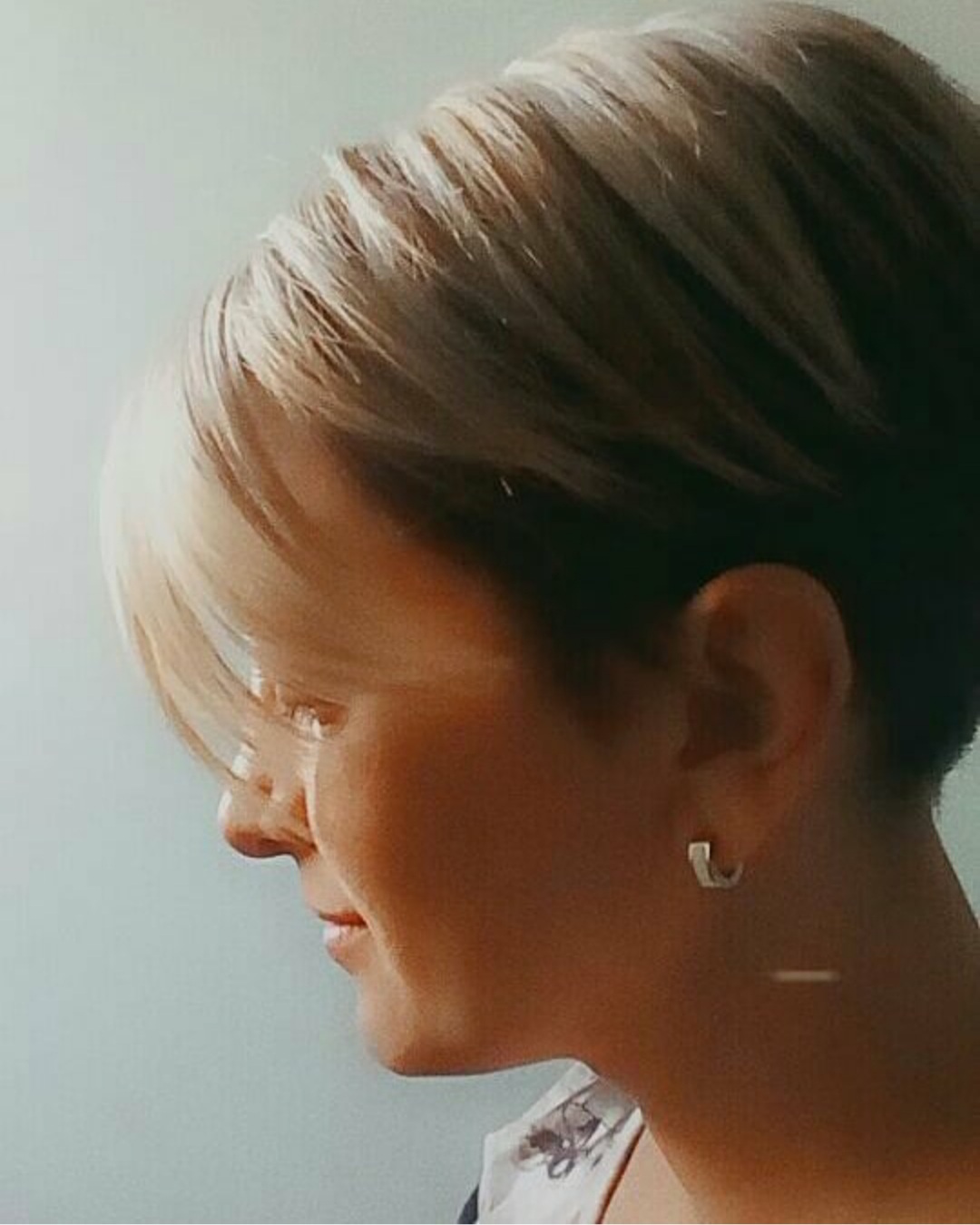 Se trata de un corte muy corto con la nuca descubierta y raya al costado, para que quede de un costado al ras del cuero cabelludo (según los gustos de la clienta) y del otro lado un flequillo largo. Es un estilo canchero, ideal para economizar tiempo en el peinado.