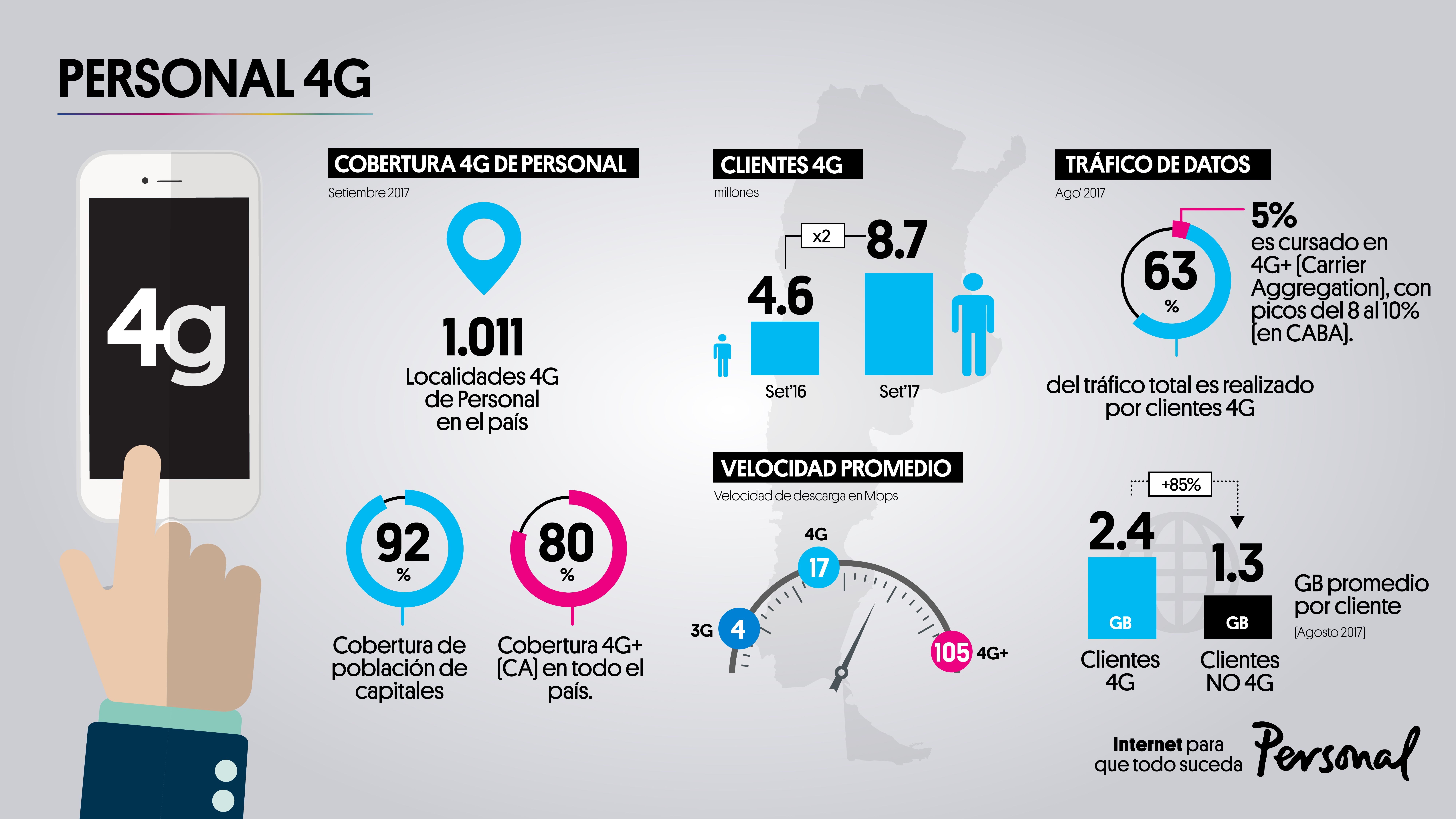 Desde mediados de 2016, Personal viene evolucionando sus redes hacia mayor velocidad de navegación móvil con 4G+, utilizando las combinación de dos bandas de frecuencia en simultáneo.