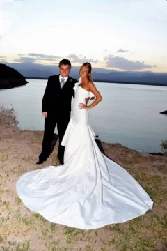 La novia lució un diseño de Francisco Zito, con el peinado de Soledad Cassab. De luna de miel, partieron hacia las playas brasileñas de Buzios y Río de Janeiro.