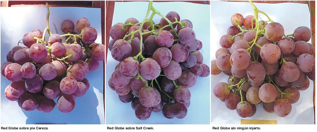 En lo que respecta al peso de racimos, diámetro ecuatorial de bayas y porcentaje de racimos exportable se obtuvieron los mayores valores en la cv Red Globe injertada sobre los portainjertos Cereza y Salt Creek. El Color de cubrimiento de las bayas fue Rojo-Rosado en los tratamientos Harmony y Freedom y Rojo-Rojo Púrpura en Franco, Cereza, Salt Creek y Ruggeri 140. Al analizar los resultados en Superior Seedless se observaron los mayores valores de peso de racimos y rendimiento en el portainjerto 140Ru. SO4 y Salt Creeck alcanzaron el mayor valor de diámetro ecuatorial de bayas. Ruggeri y Salt Creek obtuvieron los mayores porcentajes de racimos exportables.