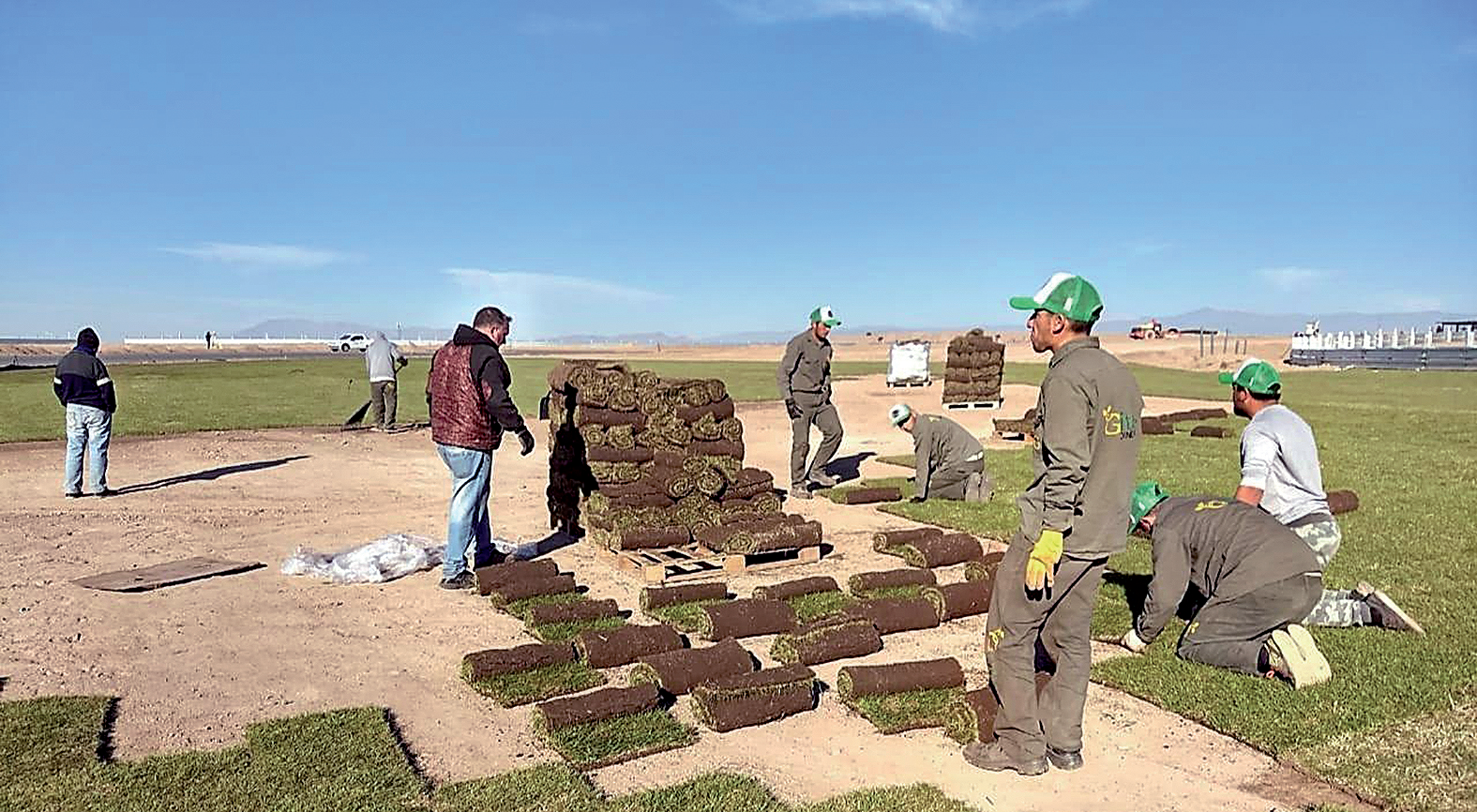 Se empezó en junio y se culminó en septiembre, siguiendo con la etapa de mantenimiento en octubre. Un grupo importante de gente, nivelación fina, fertilización, instalación de rollos y equipo de riego por aspersión, una empresa de Mendoza, Nuevos Verdes, con la provisión del césped, y una de San Juan, Gaita Jardinería, con la mano de obra en general.