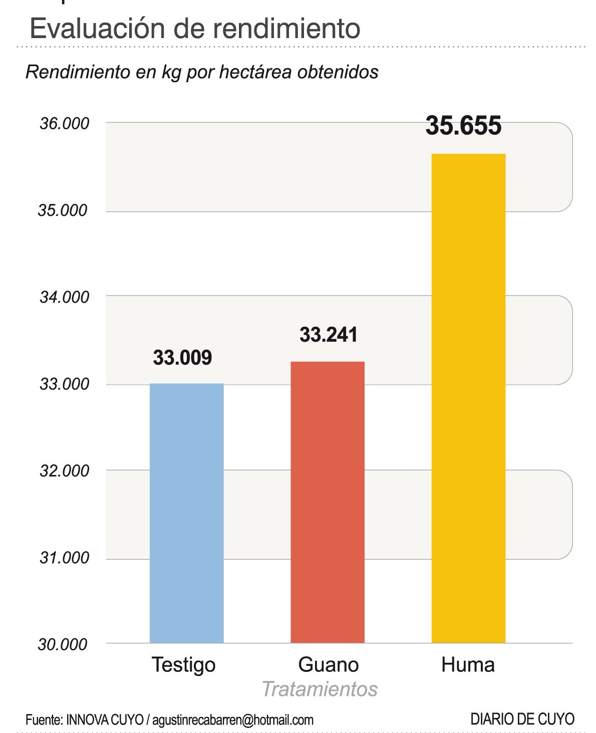 Entre los números relevantes figura que para la variable rendimientos, no se obtuvieron diferencias estadísticas significativas entre los tratamientos. El tratamiento N°3 (Huma) con 35.655 kg/ha estuvo por encima del resto de los tratamientos, y con alrededor de 2.400 kg menos le siguió el tratamiento N° 2 (Guano). La variable peso de planta, peso de bulbo y peso aéreo indica que el tratamiento N°3 el que se ubicó por encima de los otros tratamientos con los valores más altos en las tres variables.