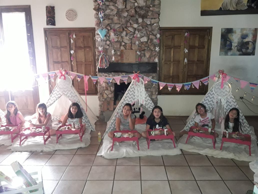 "Se cuidan absolutamente todos los detalles. En general no hay elementos de vidrio -salvo un dispenser de jugos- y nada se enchufa para evitar peligros para las nenas”, cuenta María José Toia, quien decidió diversificar su profesión de psicomotricista, con esta propuesta recreativa. Sumó a su socia, Verónica Laría, que es farmacéutica y juntas hicieron nacer a Indian Party Eventos temáticos y pijamadas. Para concretarlo, hicieron construir especialmente estas carpitas tipo chozas, de dimensiones más amplias a las que se consiguen en el mercado, para darles más espacio de juegos a los niños. En cada carpa tipi, entran cómodamente 2 personas.