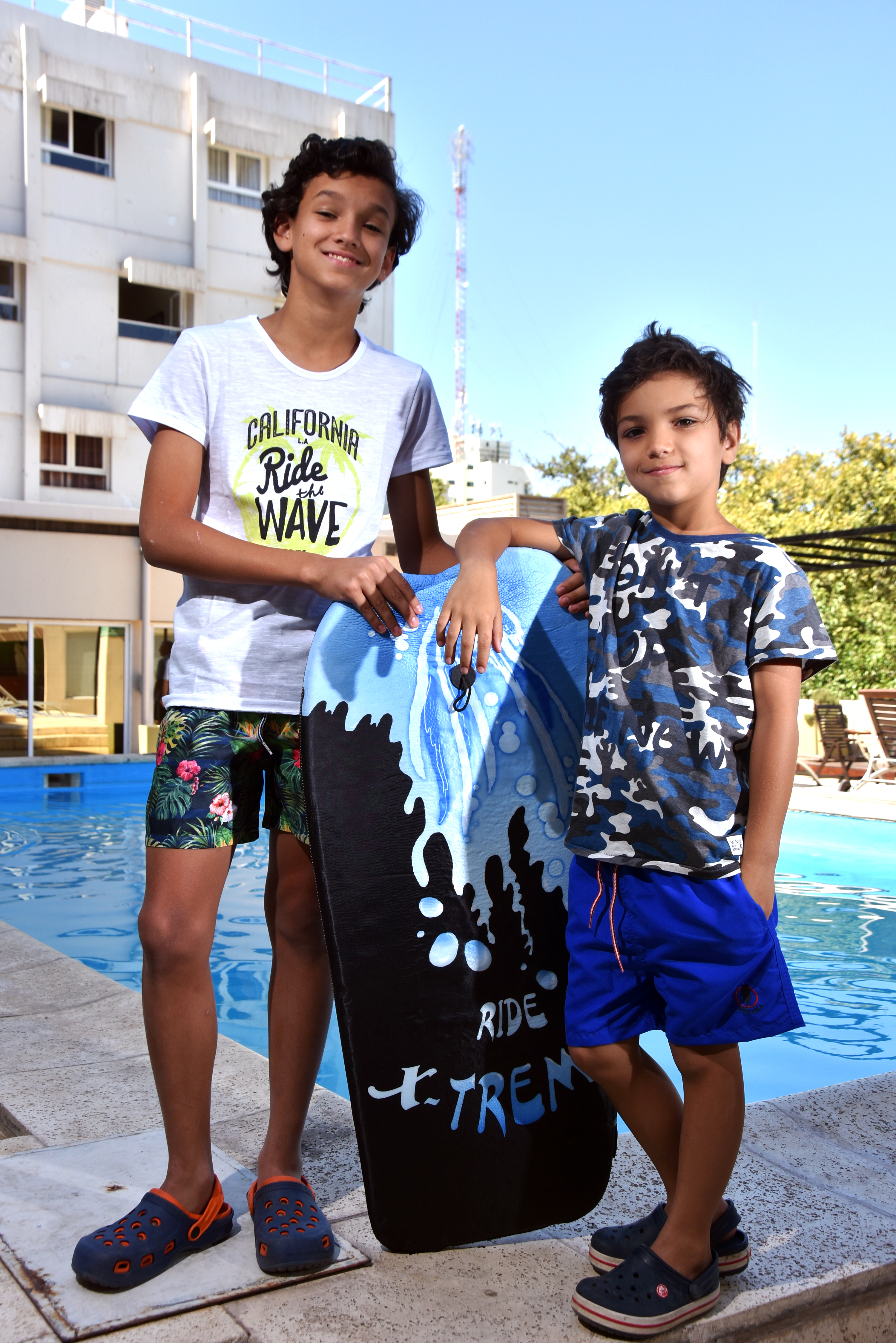 Domadores de olas. Valentín con short de baño floreado ($2449 Wanama) y remera con leyenda y detalle en color flúo ($1189 Wanama). Manuel con short de baño ($1889 Wanama) y remera camuflada en tonos azules, celestes, blanco y negro ($1889 Wanama). Como detalle: barrenador ($1049,90).