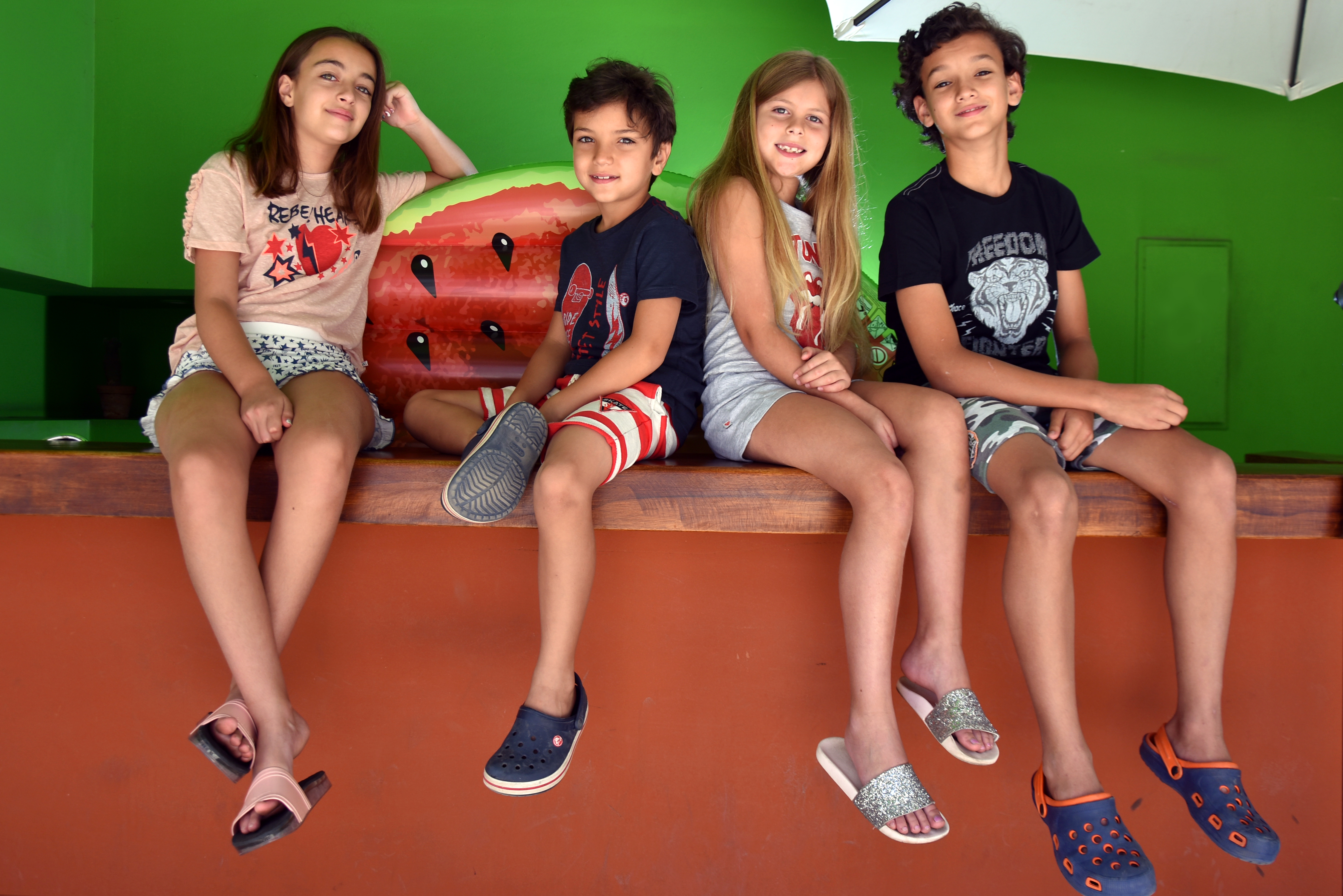 Salida de amigos. Manu con remera con dibujos de skates ($1219 Wanama) y bermuda rayada al tono ($1749 Wanama), Amparo con mono con el símbolo de los Rollings Stones ($1689 Wanama), detrás Victoria que tiene un short estampado ($1289 Wanama) y remera estampada con vuelitos en las mangas ($1089 Wanama), y el último de la fila, Valentín con con remera de algodón ($1219 Wanama) y bermuda camuflada ($1689 Wanama).