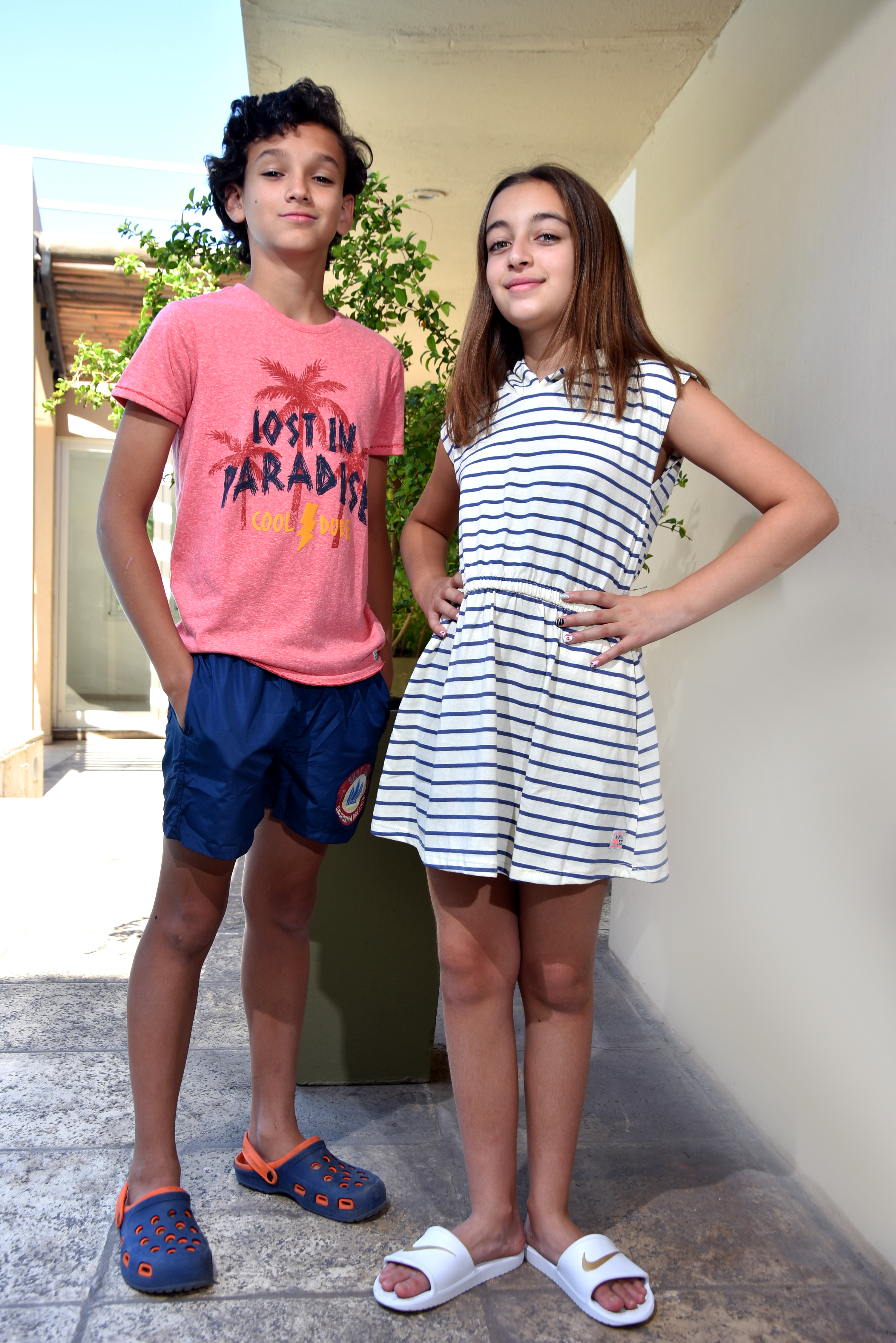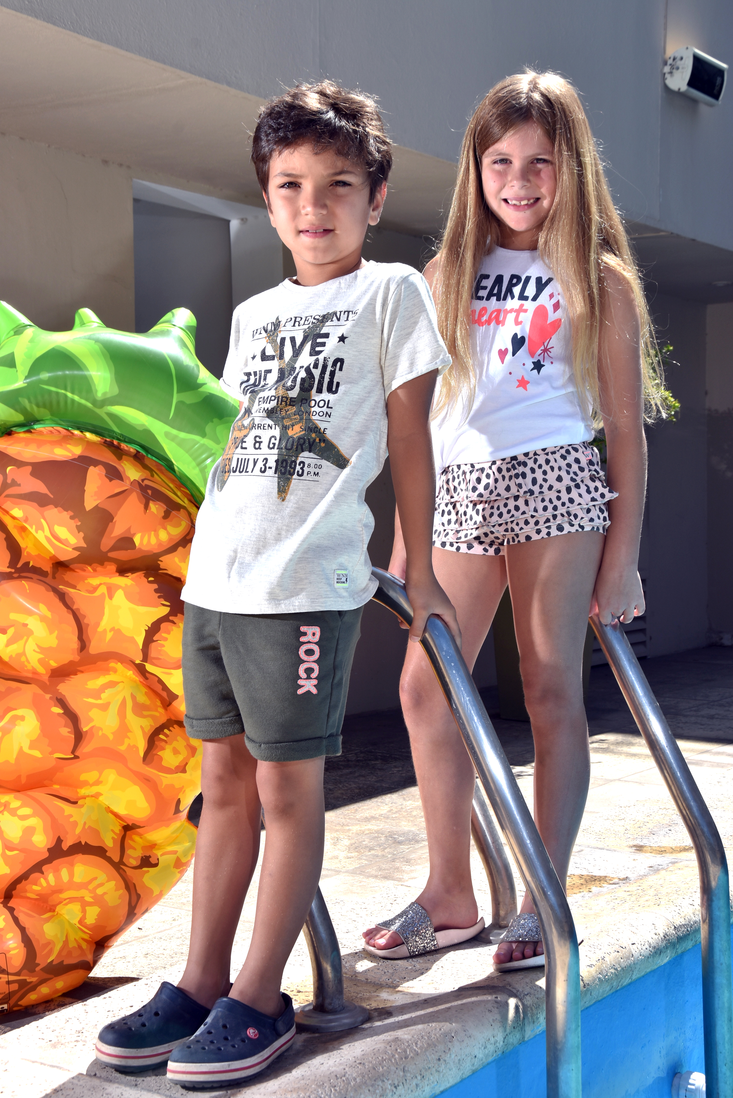 Tiempo de tomar sol. Amparo con musculosa con leyenda ($989 Wanama) y short simil animal print con vuelitos en el reverso ($1389 Wanama). Manu con remera estampada ($989 Wanama) y bermuda ($1589 Wanama).