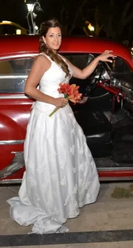 La novia lució un diseño del taller Alta Gracia, de Encarnación Muñoz y Gladys Rodríguez, con el peinado y maquillaje de Ricardo Azcurra. De luna de miel, partieron hacia la localidad atlántica de Necochea.