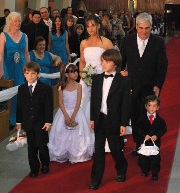 La novia ingresó con un pequeño cortejo de sobrinos: Facundo (2) y Gonzalo Ruiz (6), Camila Castillo (6), Valentina Garín (5) y Leandro Moine (9). Fueron padrinos sus padres, Amalia Manzano y esposo, Francisco Ruiz Alvarez, Lidia Aguilar y esposo, Carlos De la Vega. Testigos, Rubén Reinoso y Rita Valeria Díaz.