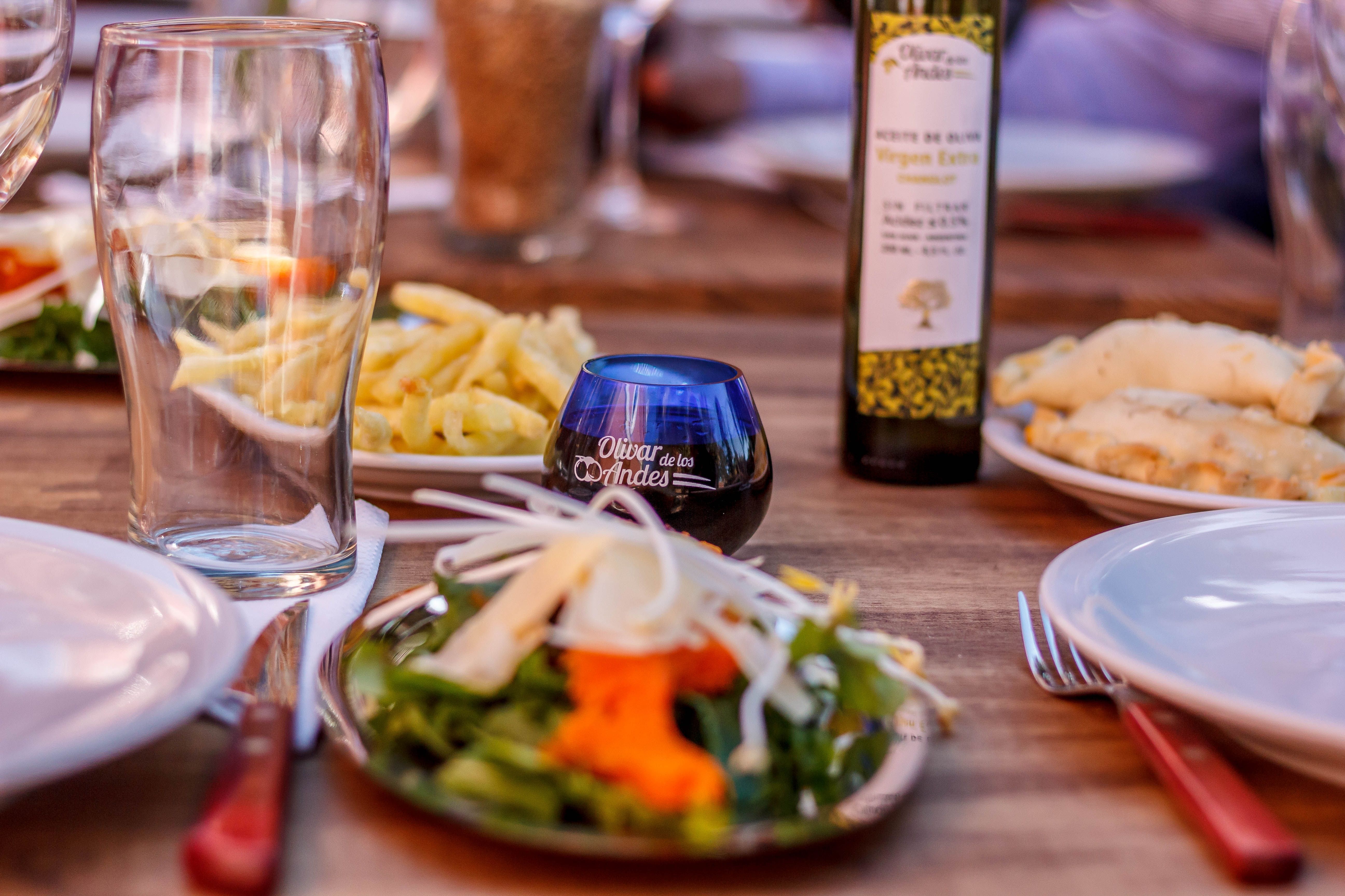 Según detalla Marcos Vallejos, encargado de Restaurante y Turismo del emprendimiento, el chef Javier Ortuño armó un menú acorde al lugar: todo tiene su toque de aceite de oliva desde la entrada al postre. De hecho, llevan un cuenco con diferentes variedades de aceites para catar y degustar antes de disfrutar de la comida propiamente dicha que consta de una entrada (en la que se pueden elegir empanadas sanjuaninas en horno de barro, pasteles criollos fritos en Aceite de Oliva Virgen Extra Blend Arbequina-Coratina o brusquetas pinceladas en Picual), el plato principal (carne a la llama con verduras al rescoldo o vegetales frescos de estación aromatizados con la variedad Coratina; o para los vegetarianos anquitos gratinados al horno de barro con Coratina, verduras de estación al Aceite de Oliva Virgen Extra y para los chicos hamburguesa casera a la chapa con papas fritas) y el postre que también llega con un toque de aceite: como el queso fresco y dulce de membrillo con gotitas de Changlot; la alcayota con queso, nuez y sazón de aceite variedad Picual, entre otros.