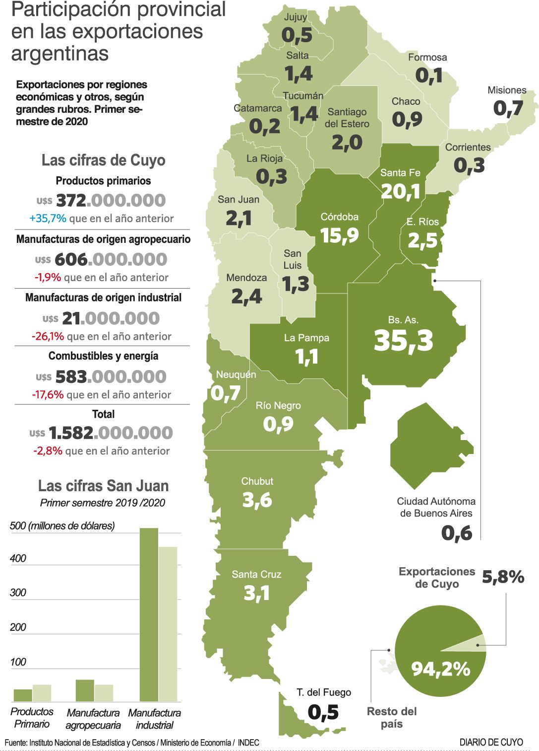 San Juan participó en el primer semestre con el 2,1% conforme a los datos del INDEC. Las exportaciones de la provincia de San Juan totalizaron U$S 565 millones FOB en el transcurso del primer semestre de 2020, con una baja de 8,9% respecto al mismo período del año anterior por el contexto pandémico; totalizaron 35,7% del total de las ventas al exterior de la región Cuyo. Los ajos, con 5,1% del total de las exportaciones fueron los que más crecieron con una suba de 123,1% respecto al año anterior. Otro rubro destacable fue preparado de hortalizas, legumbres y frutas (4,8%), fundamentalmente se trató de jugos de frutas y hortalizas que, en particular, lograron un crecimiento de 11,1% respecto del año anterior.