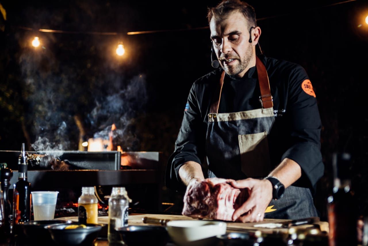Para mostrar lo que es capaz de hacer, va a tener en su parrilla un Matambrito de cerdo con peras deshidratadas, provolone y pimientos asados con pasta de berenjenas asadas y un Ojo de bife con salmuera sobre tomaticán ahumado y chimichurri.