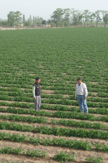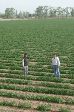 Juan Carlos Linares y Antonio García, productores de San Juan que ganaron el "Gran Premio Tomate 2000" el año pasado, el máximo galardón que entrega la Asociación Tomate 2000, este año instalaron un sistema de goteo, llamado Lay Flat en una de sus fincas, ubicada en calle Vidart, cerca del INTA Pocito. El lote de 4,8 hectáreas, tiene tomate Líder, de la semillera Caps, y un crecimiento importante. La gran novedad es que se trata de un equipo semimóvil, es decir se desarma y se puede llevar a otra finca. Simplemente hay un pozo de bombeo, una cañería matriz superficial y mangueras secundarias de las que salen las líneas de goteros. Aquí es todo manual, la apertura, el cierre y el manejo general. Está a 1,40 metros entre líneas y con 5 líneas secundarias manejan el lote, tiene 43 metros para cada lado de cada manguera azul. En el momento de la visita regaban, siendo hoy el ritmo de 1 hora en la mañana y 1 hora en la tarde. En esa finca obtuvieron 80.000 kilos por hectárea, y la idea de Linares y García es aumentar.