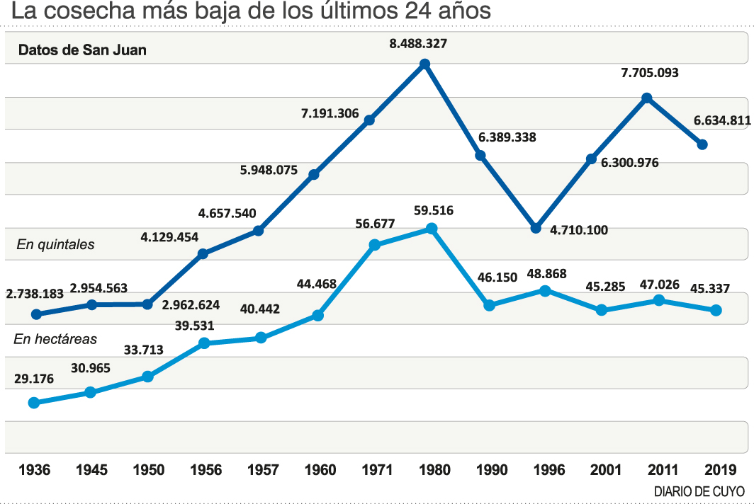 Después de un cuarto de siglo San Juan no ha registrado una cosecha similar. En 1996 la sequía se llevó el 30% de la producción de las uvas arrojando una cosecha de 471 millones de kilos, cercana a los 483 millones de esta temporada. Comparado con la cosecha 2019, la provincia arrojó una merma del 26% incluidos todos los destinos (bodega, pasa y uva en fresco).