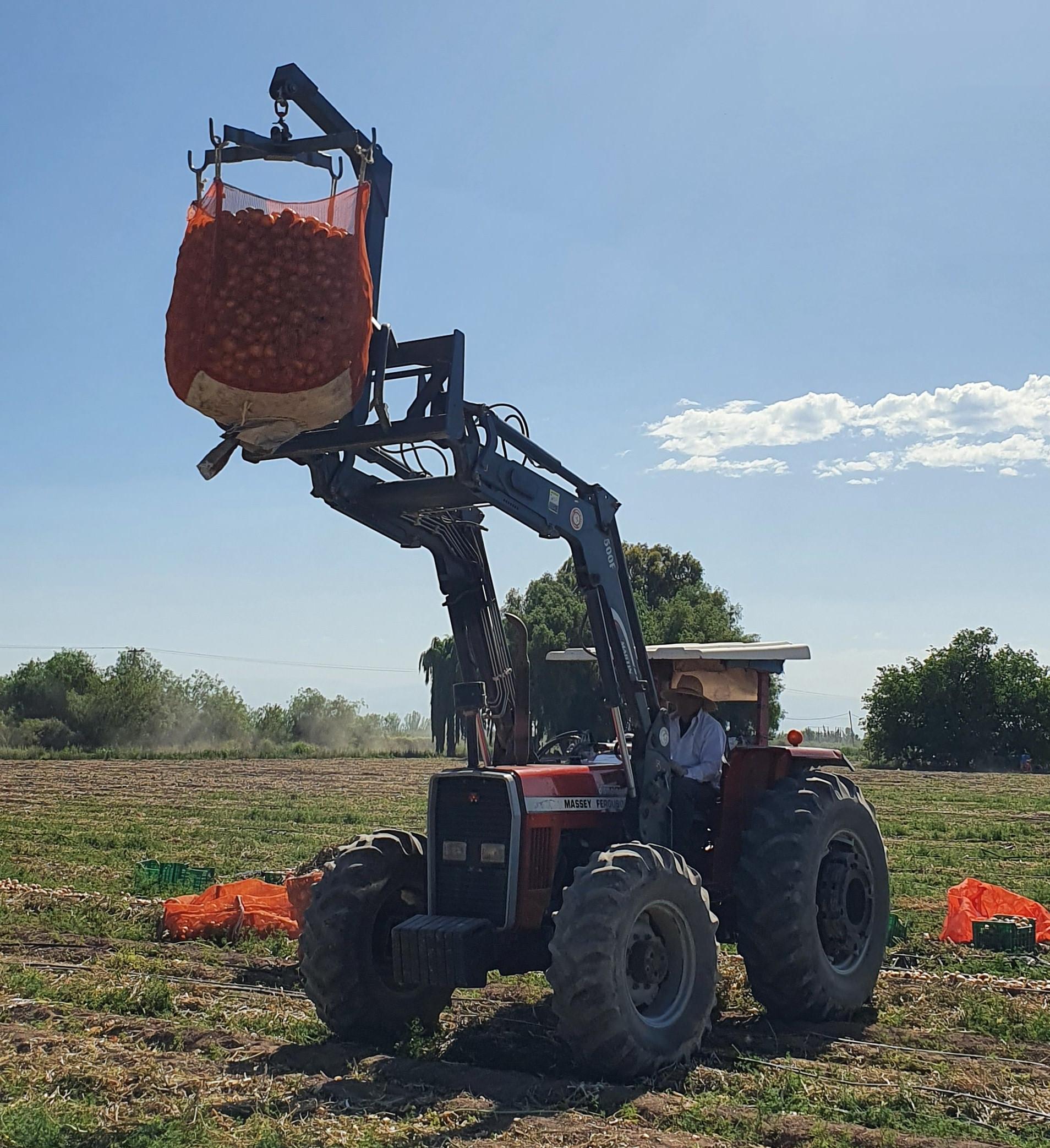 Otra interesante forma de recolección de la cebolla, es en bolsones de 430, 450, 470 y casi 500 kilos, individuales, que son elevados mediante un tractor con aparato adaptado y van a un camión, para ser llevados a clasificar en galpón, con máquinas de procesamiento, seleccionando tamaño y calidad.