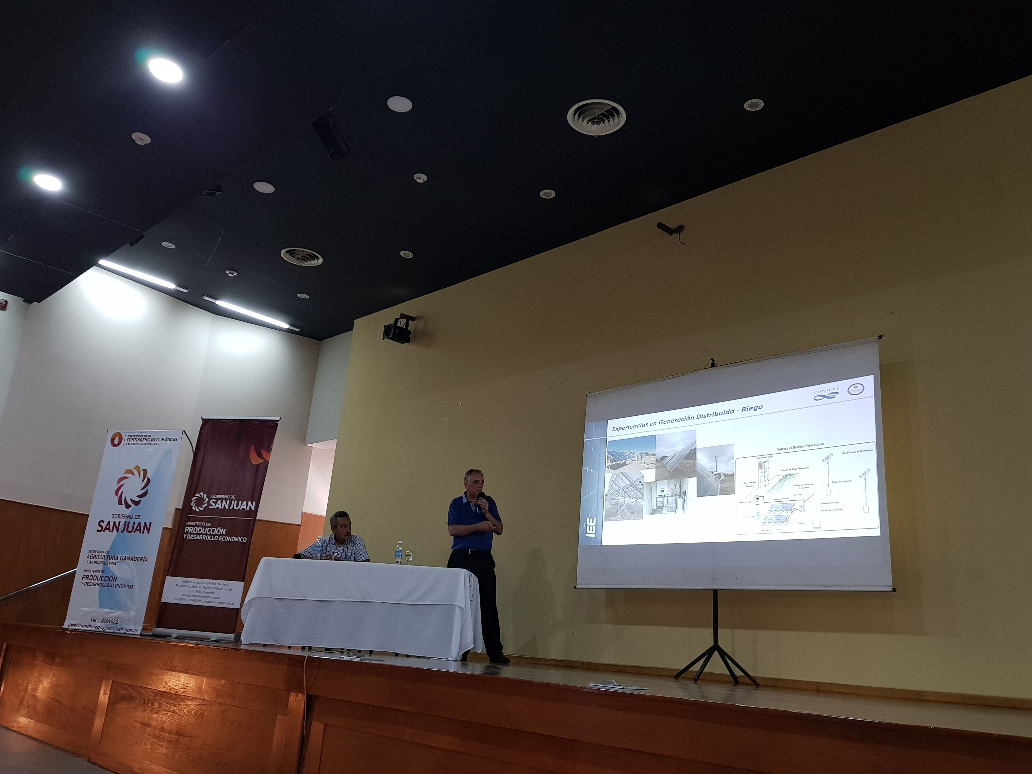 Posteriormente, el ing. Marcos Facchini, del Instituto de Energía Eléctrica, de la UNSJ en convenio con Conicet, se explayó sobre "Aplicación Piloto para Riego Agrícola de Sistemas Fotovoltaicos con Conexión a la Red Eléctrica de Distribución -GD- Normativas".