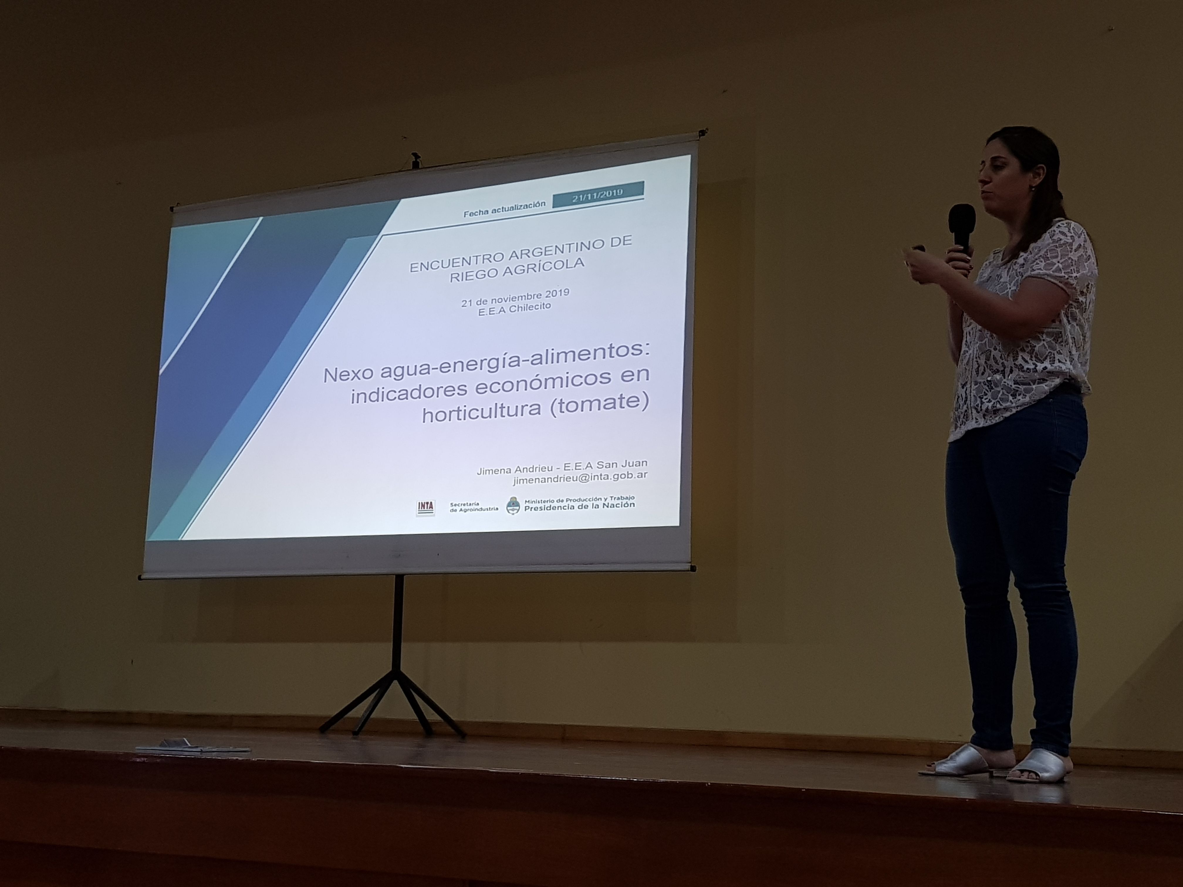 Entre las disertaciones, Jimena Andreu, de la EEA San Juan del INTA, abordó "Nexo: Agua-Energía-Alimentos, indicadores económicos en Horticultura". La economista informó que "primero veremos el contexto argentino, luego el costo productivo en relación al costo del riego, y finalmente las variables para decidir cambios en nuestros modelos de usar el agua de riego".