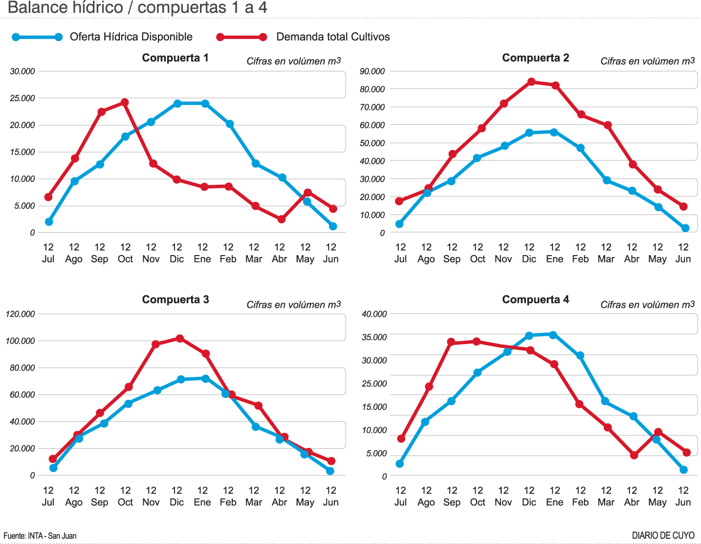 Y afirma: "Esto crea grandes ineficiencias derivadas de los desfasajes con la demanda de agua, creando además fuertes inequidades en el sistema. En un segundo trabajo publicado, se construyen tres escenarios de uso flexible del agua y sus eficiencias, traducidas a un ‘índice de cobertura’, que indica el porcentaje del agua derivada en cabecera del canal respecto a la demandada por los cultivos".