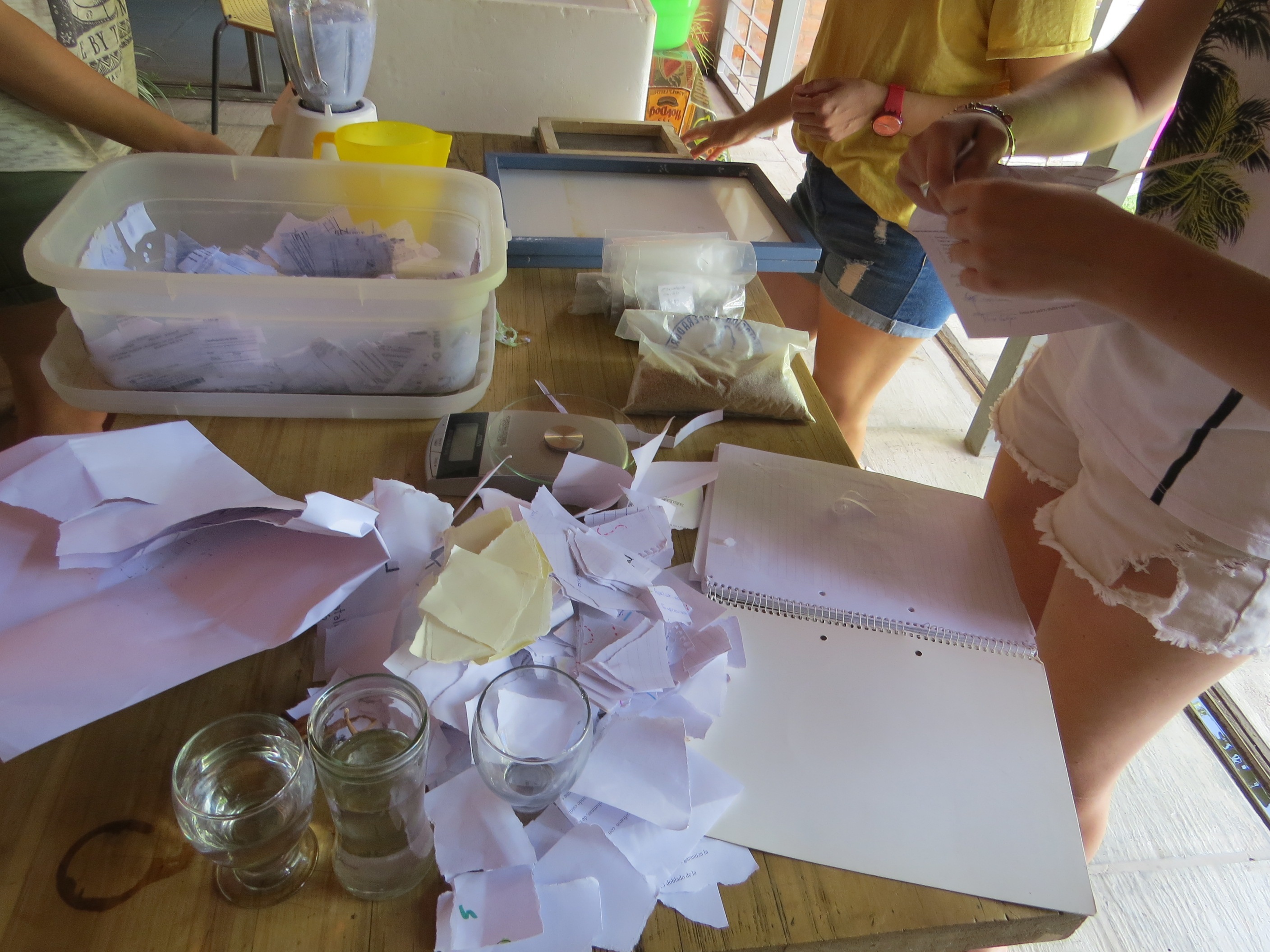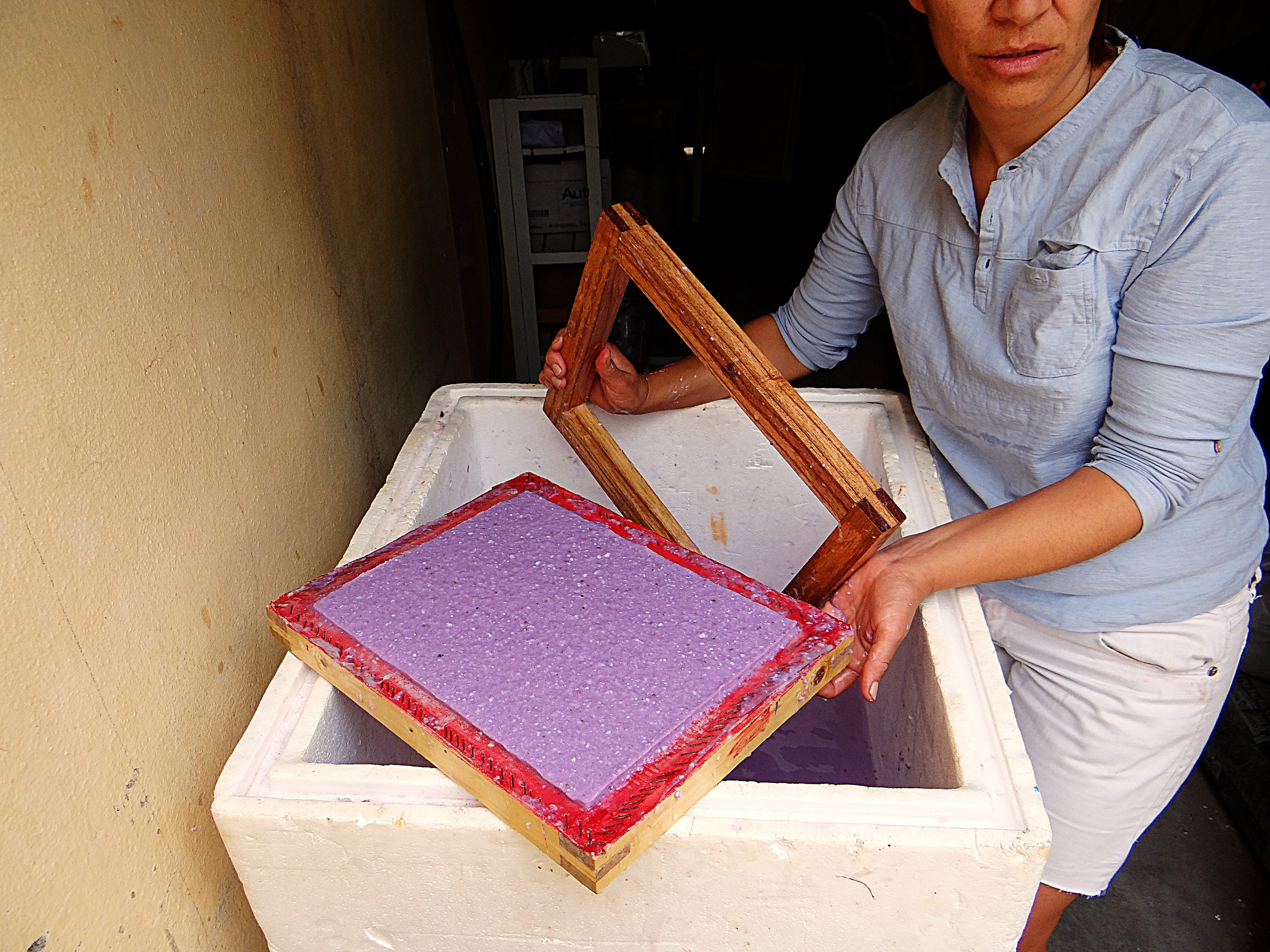 Las hojas de papel -no importa la calidad ni la cantidad aunque es importante clasificar y dividirlas según sus características para que la pasta que se obtenga sea homogénea- se deben introducir en un recipiente con agua. Ahí deben permanecer por varias horas, hasta un día para que el material se humedezca bien al punto de ablandarse. Luego esas hojas blandas se procesan en una licuadora -puede ser doméstica o en el caso del emprendimiento en una semi industrial que tiene más capacidad y potencia- hasta obtener pulpa de celulosa que se debe volcar en otro contenedor con agua. Se agregan las semillas y se mezcla bien. Ese material se lleva a un tamiz, una especie de colador que a su vez le dará la forma de la hoja de papel reciclado y plantable. Después de unas horas, se pone a secar al sol.