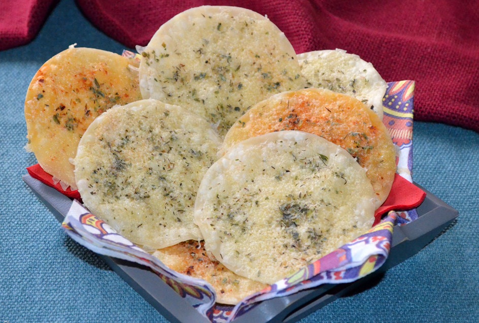 Antes de llevar al microondas, rociar una pizca de orégano y pimentón sobre cada snack y calentar por unos 2 minutos a máxima potencia. Al retirar las tapas no estarán crujientes, pero si lo harán si las dejas enfriar. El tiempo de cocción va a depender de cada microondas, por lo que la sugerencia es que vayas probando hasta lograr el punto deseado.