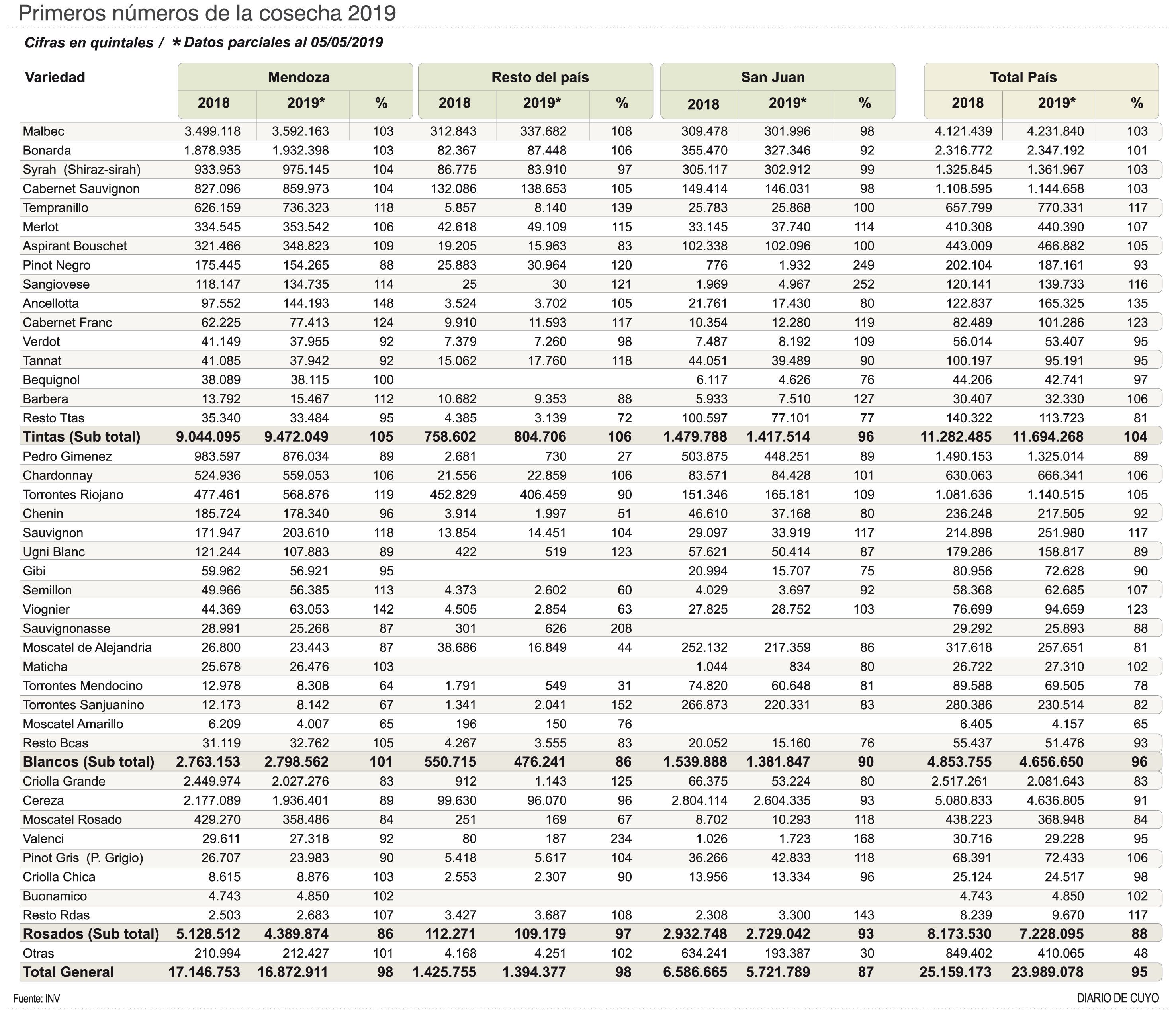 Luego aparece el Torrontés Sanjuanino con 22 millones (3,8 %) y la Moscatel de Alejandría con 21,7 millones de kilos (3,7 %), el Torrontés Riojano con 16,5 millones (2,8%) y el Cabernet Sauvignon con 14,6 millones de kilos (2,5 %).