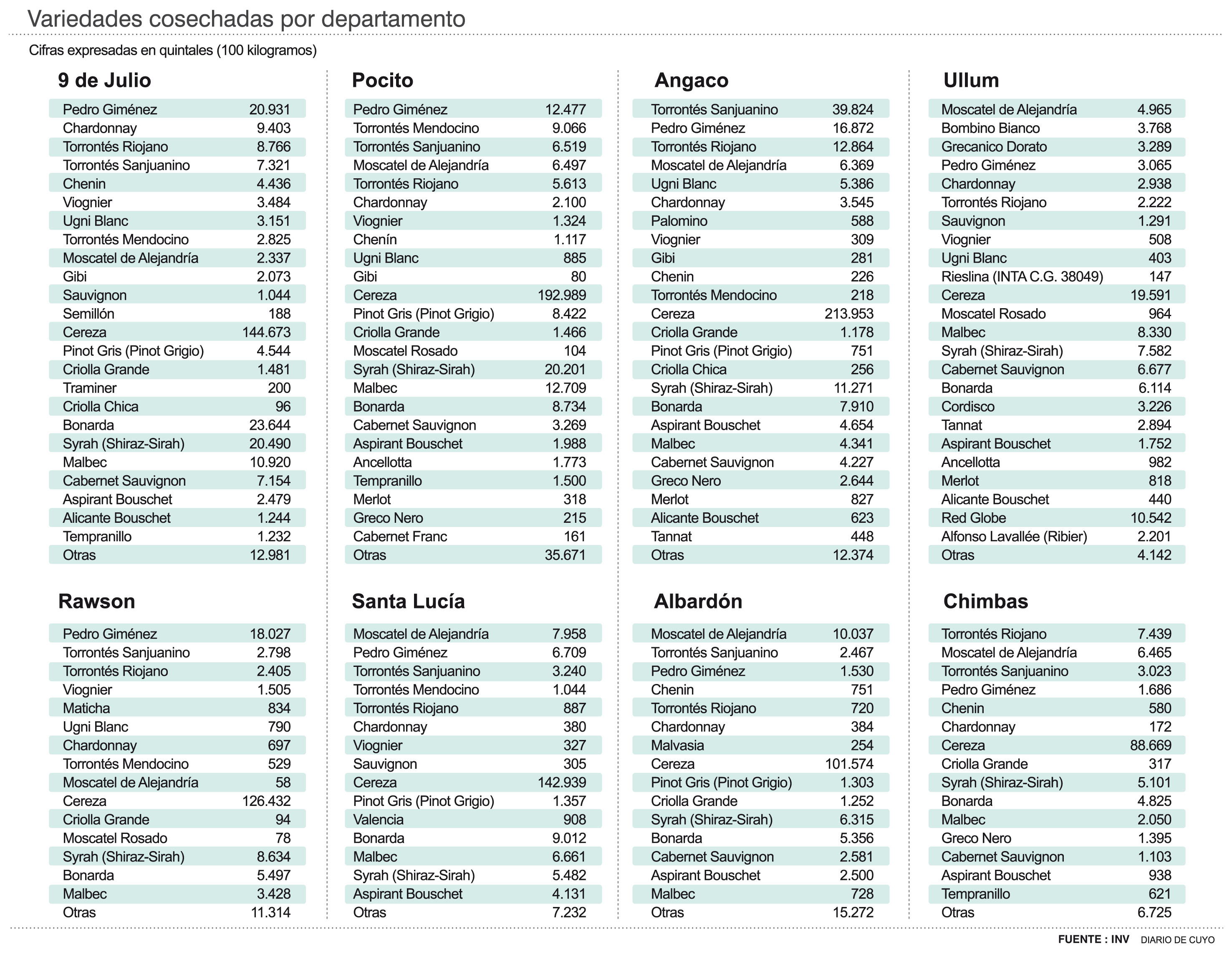 Le sigue en importancia 25 de Mayo que con 9.125 hectáreas elaboró para vinos y mostos 105 millones de kilos y Caucete con 7.456 hectáreas mandó a la molienda 101 millones de kilos.