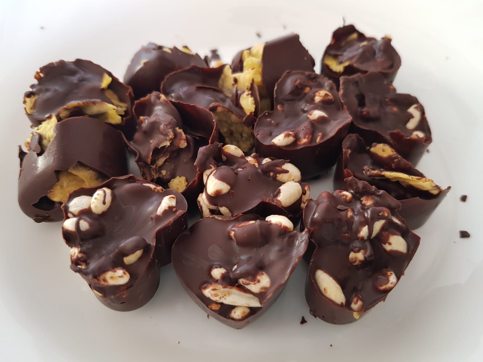 En este caso se usó un molde de bombones en forma de corazón, pero puedes usar cualquier molde o simplemente poner una bandeja forrada con papel de cocina (debe caber en la heladera). Ponemos unos cuantos copos de maíz, o arroz inflado o los dos, echamos un poco de chocolate y volvemos a poner más copos y más chocolate, haciendo como montoncitos. Una vez terminado se deja enfriar en la heladera. Hay algunos que les gusta hacerlo sólo con copos, que queda más crujiente, porque el arroz queda un poco más blando con el calor del chocolate. Además, otra opción es que puedes hacerlos con frutos secos picados como avellanas, nueces, almendras, pistachos, pasas, etc., quedan buenísimos.