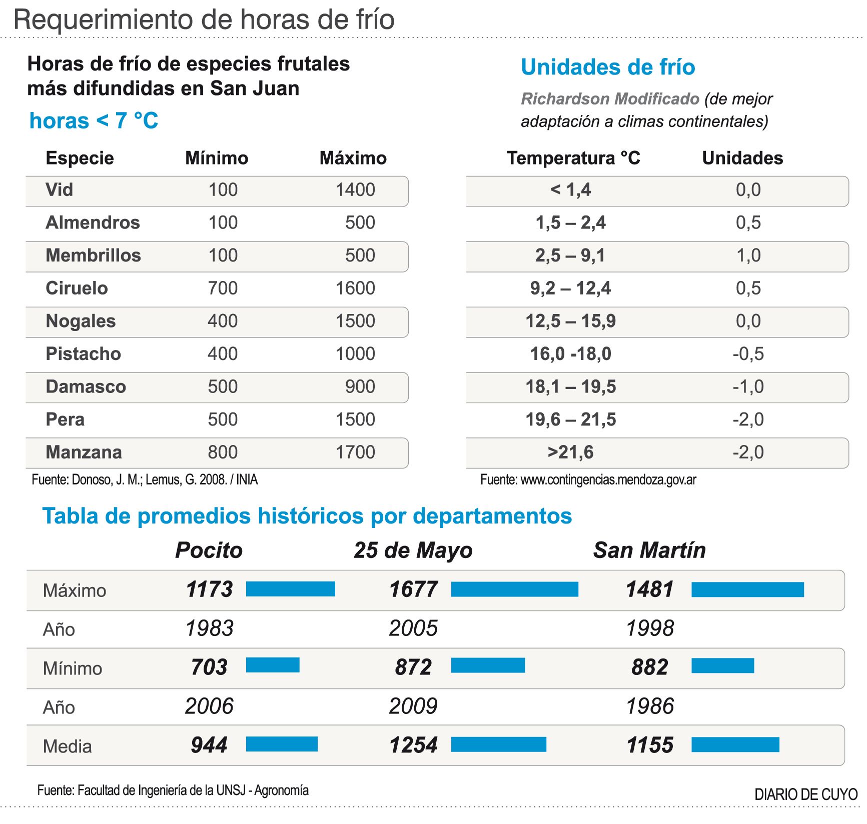 Para conocer esta oferta en San Juan, un estudiante Rolando Gabriel Vega, de la carrera de ingeniería agronómica de la Facultad de Ingeniería de la UNSJ, inició los cálculos de la oferta de horas frío para los departamentos de Pocito, San Martín y 25 de Mayo, estos son parte de su trabajo final que pronto será defendido para la obtención de su título de grado".