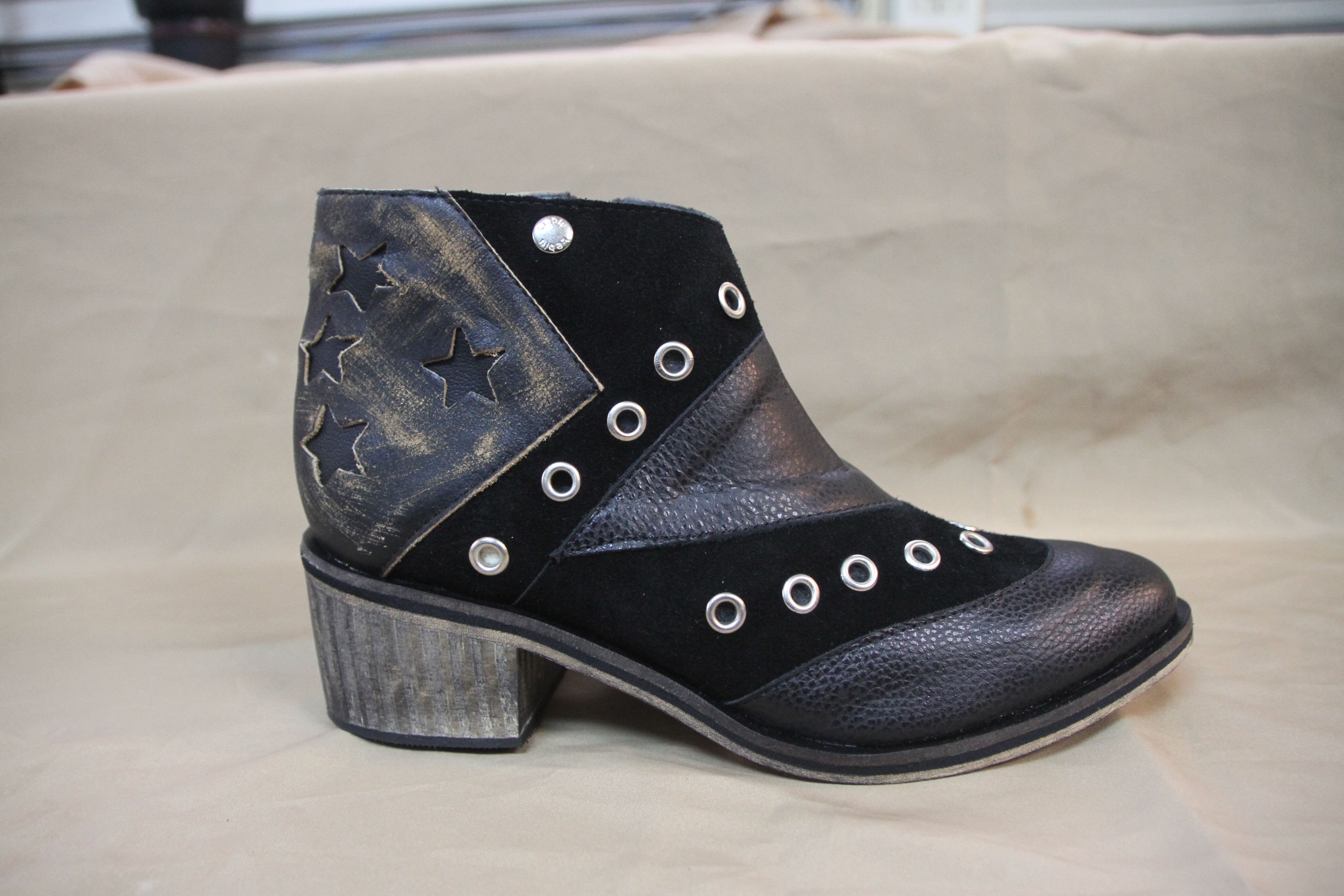 Botineta negra de cuero y nobuck, con talonera trabajada en cuero gastado y estrellas caladas con hileras de tachas tipo ojalillos ($2464 Leblu).