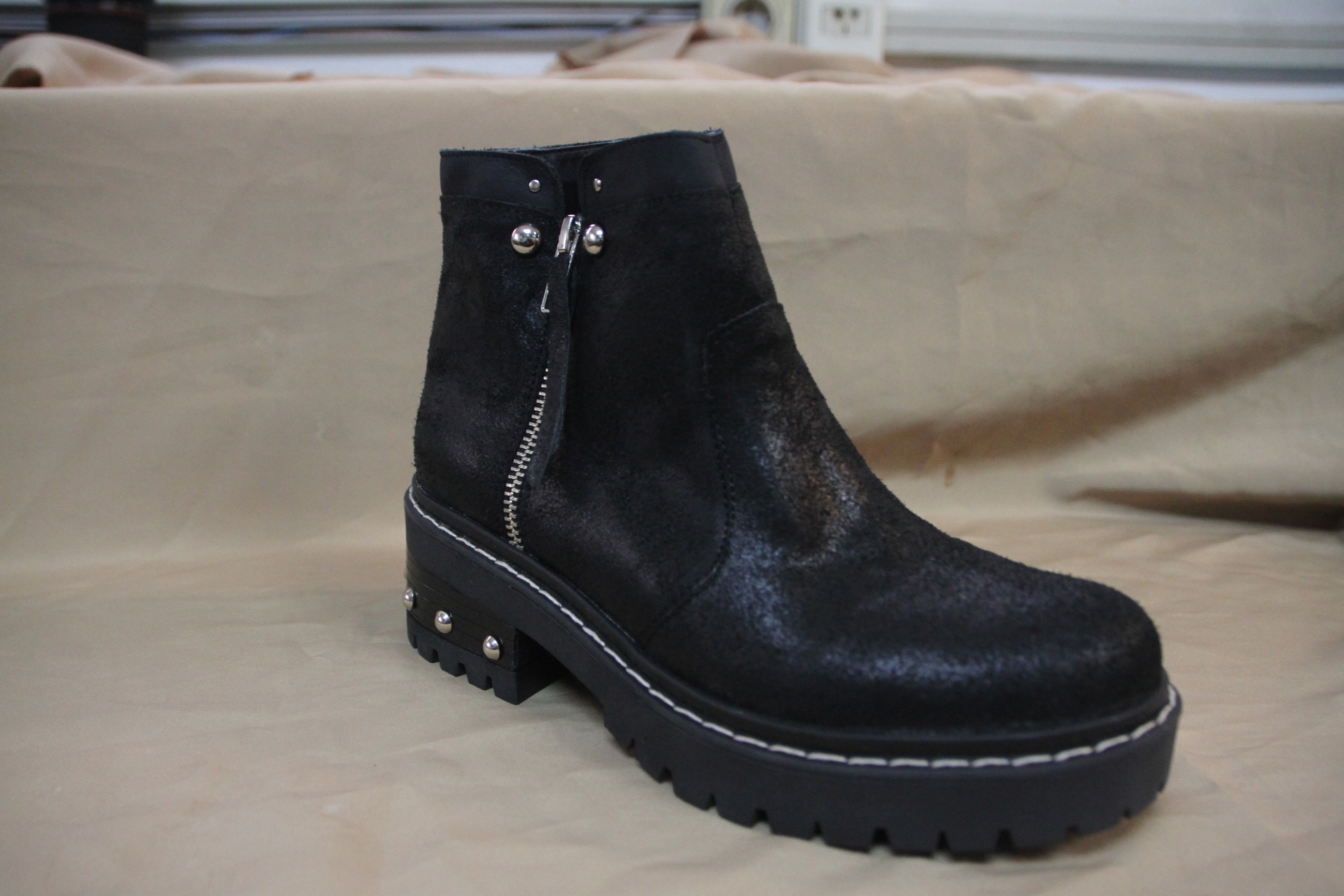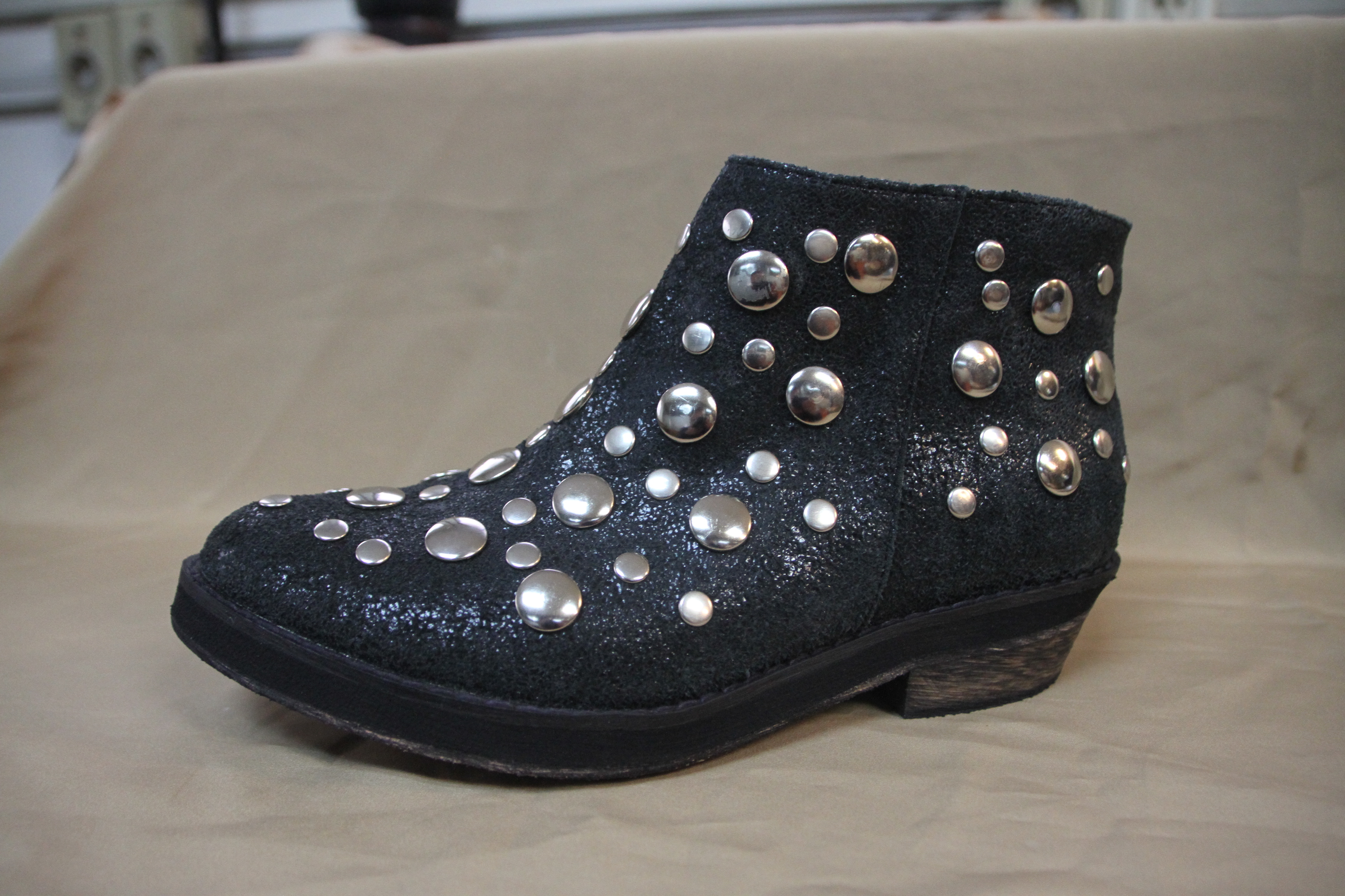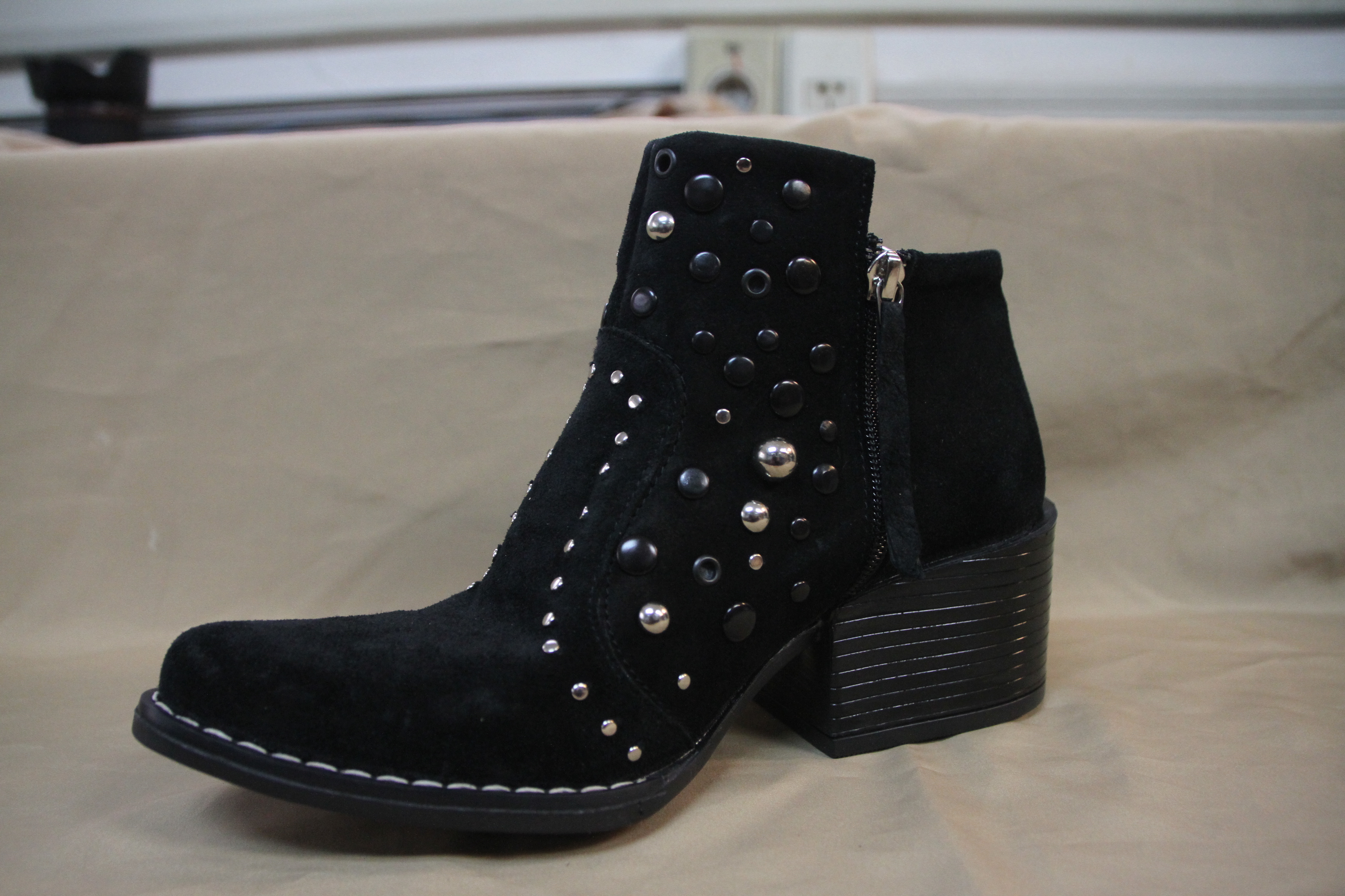 Bota nobuck gastado con tachas en el taco y a los costados de los cierres ($2475 Lucia Febrero).