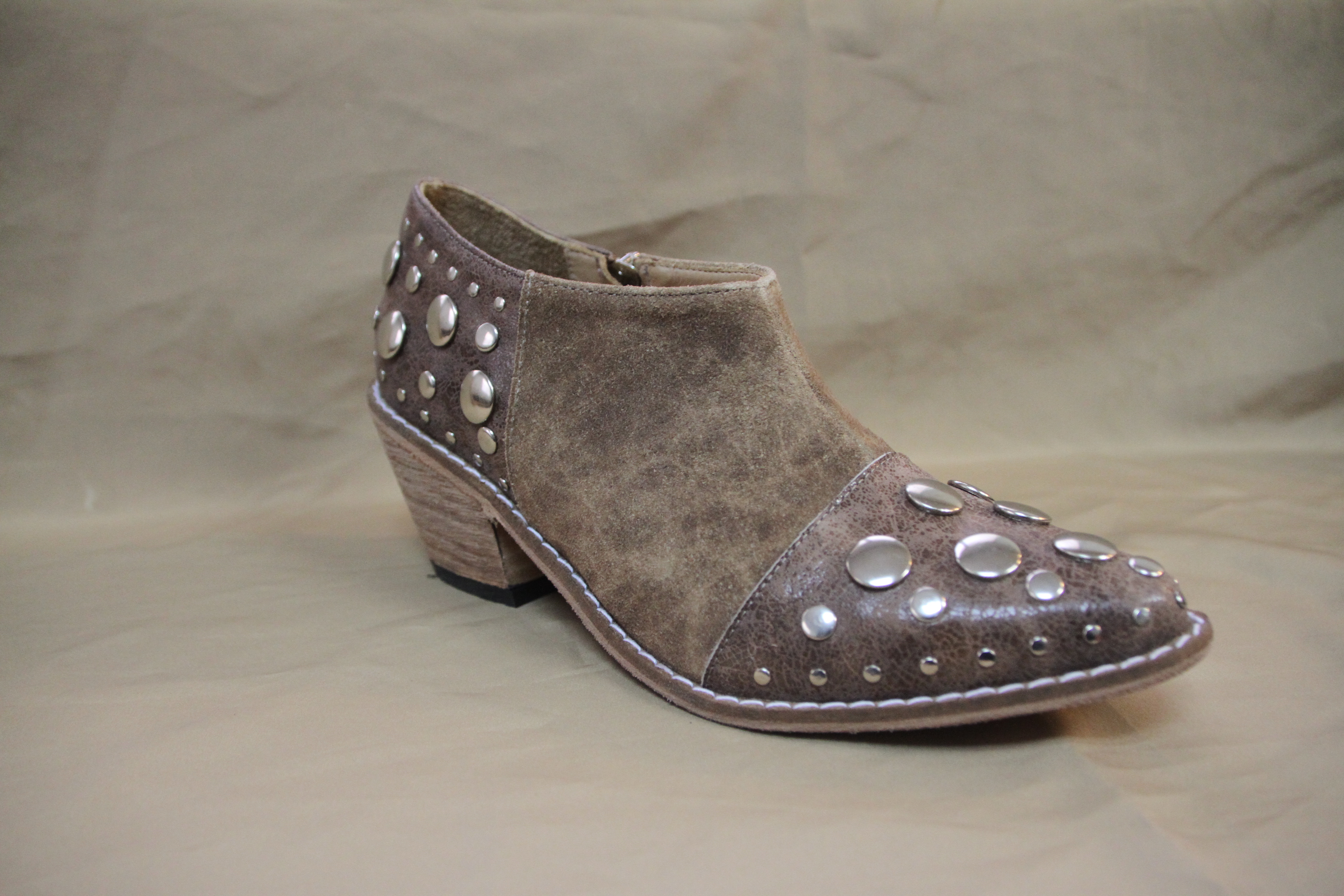 Botineta color suela de cuero texturado con tachas grandes en la puntera y el talón, con taco de madera ($2700 Muy Boutique).