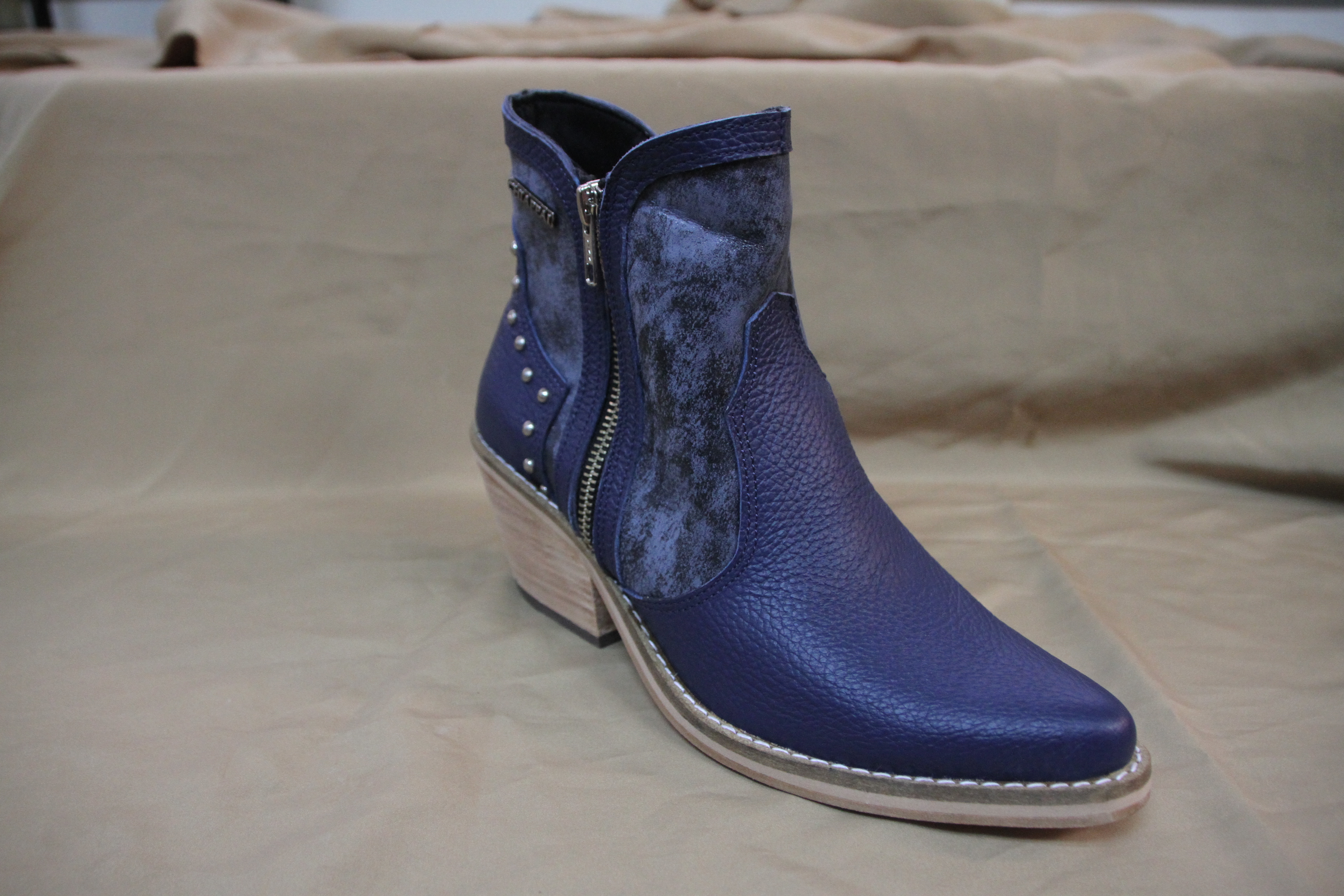 Bota corta de cuero azul liso y texturado, con pespuntes, y detalle de tachas en el talón ($3100 Chiappai).