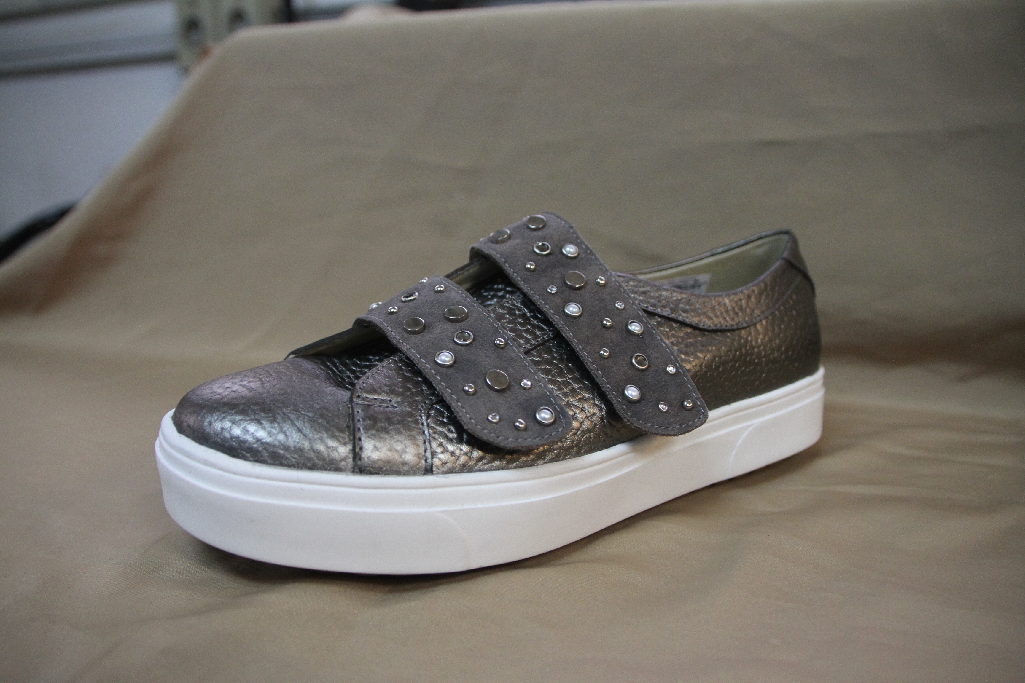 Zapatilla de cuero color peltre metalizado con tachas de diferentes formas y materiales en los abrojos para ajustar ($2630 Valerio).