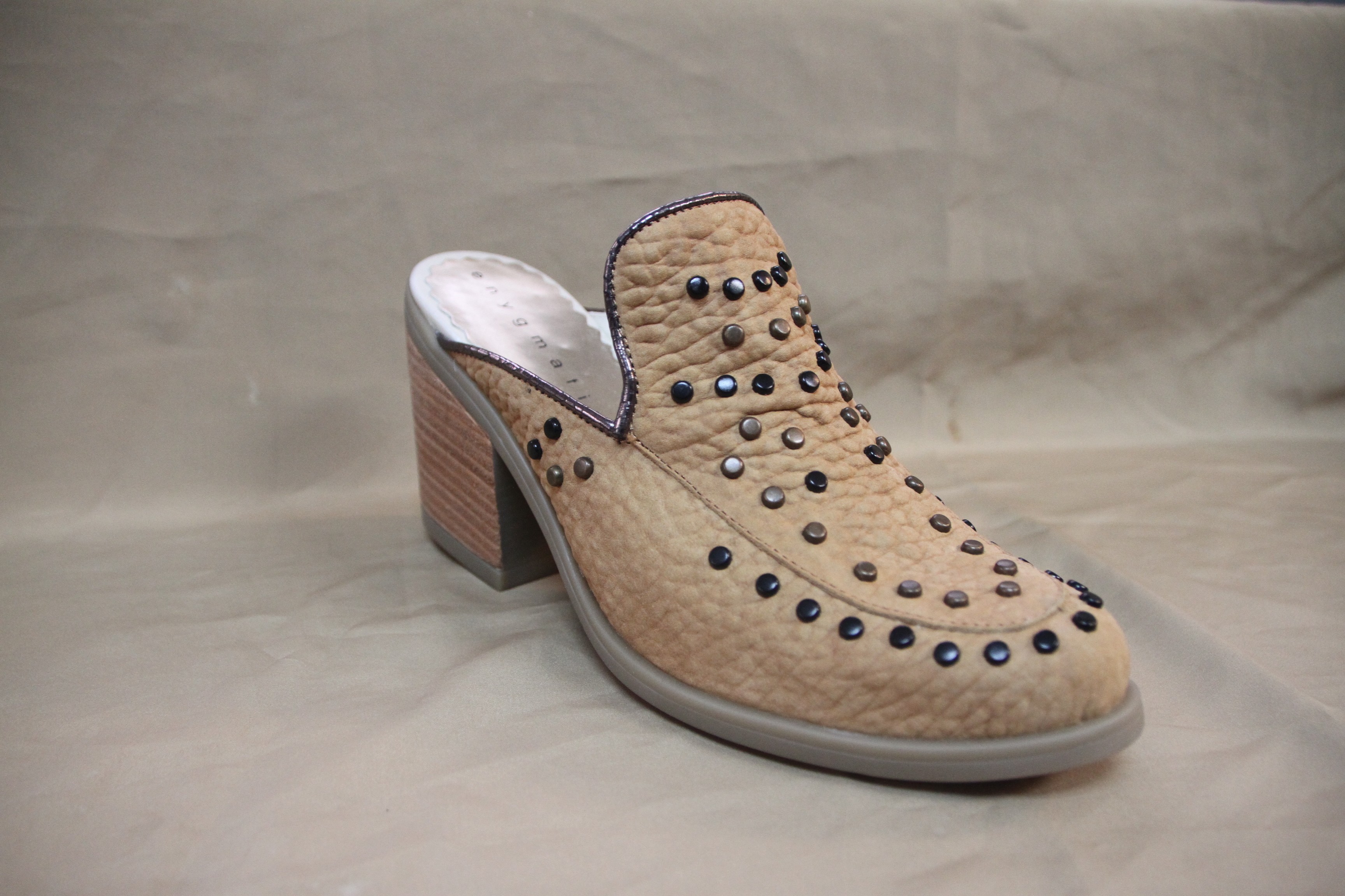 Zueco color suela en cuero texturado, taco ancho de madera y tachas planas en colores en la capellada ($2000 Enygmatics).