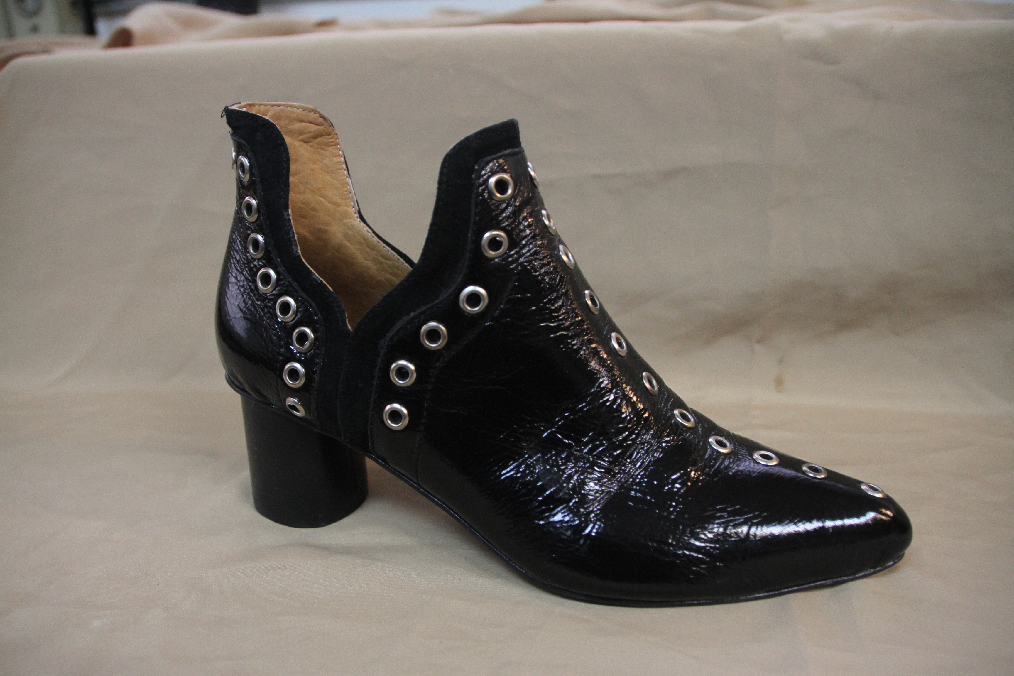 Botineta charolada con tachas argollas u ojalillos y taco redondo ($2860 Valkirya).