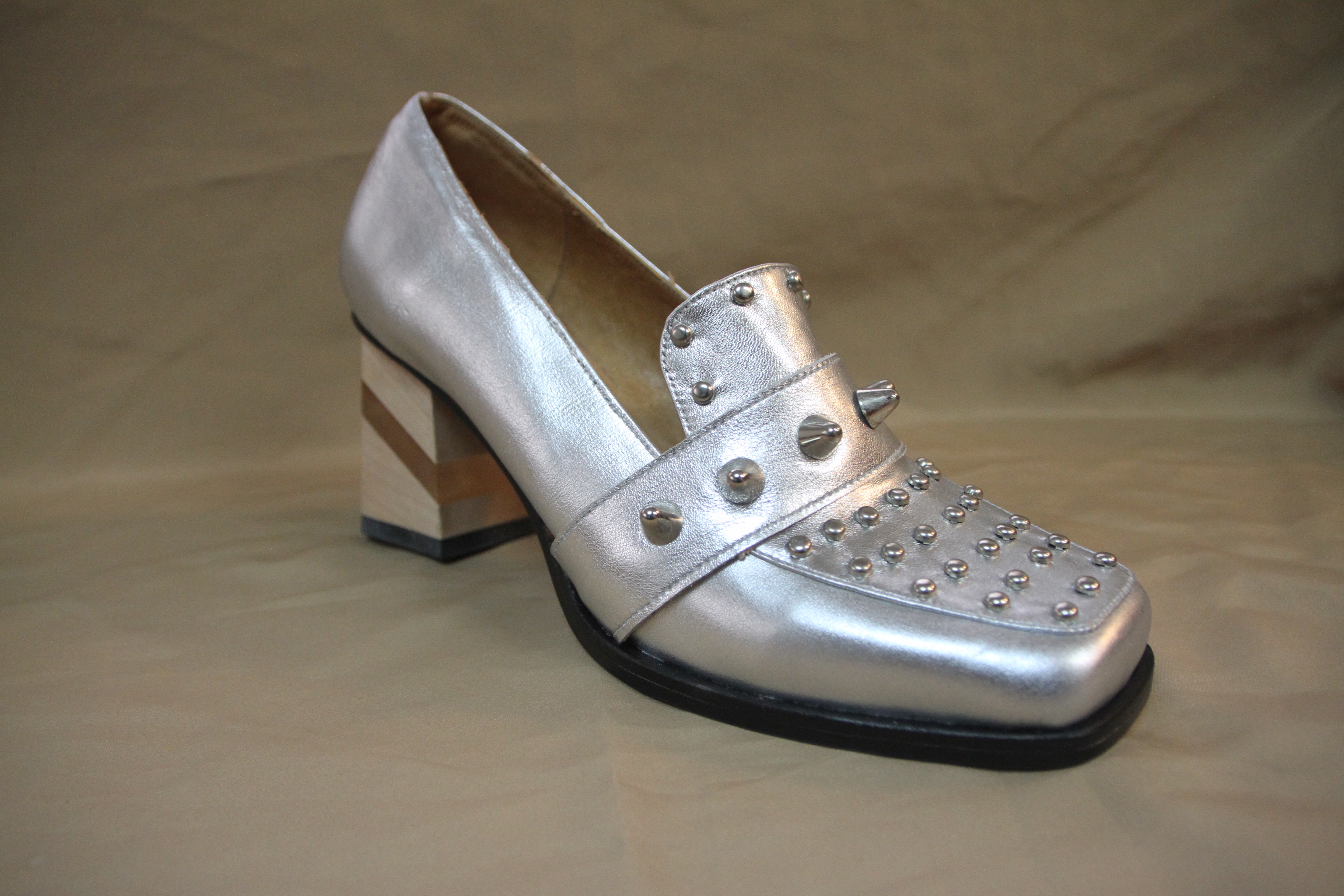 Mocasín plateado con taco de madera lustrada y acrílico, con tachas redondas y pirámide ($2420 Valkirya).