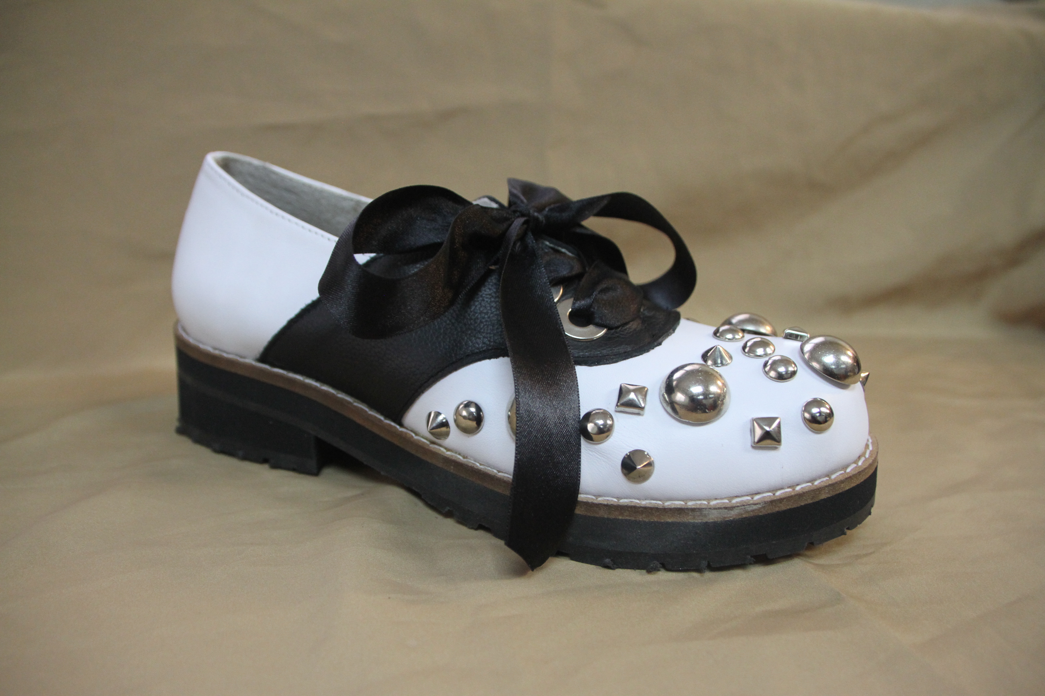 Zapato de cuero blanco combinado con negro, con lazo de raso para anudar, taco bajo y tachas en la capellada ($2640 Anjou)
