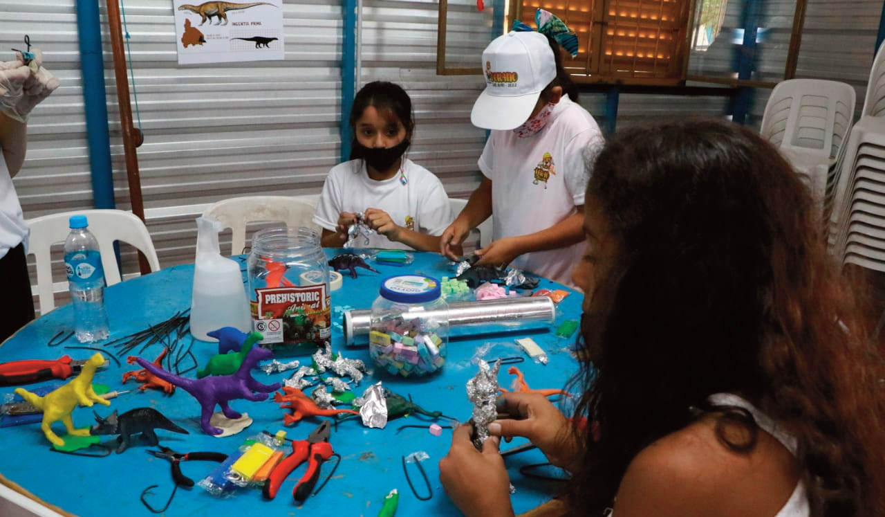 "En tablets, los niños conocen al dinosaurio en cuestión y lo activan, haciéndolo mover y correr a su gusto, por medio de la realidad aumentada. También pueden dimensionar como era su esqueleto o su cuerpo completo, pueden pintarlo, entre otras actividades. Ese sería el aspecto tecnológico que incentiva una segunda propuesta que es la creativa y se basa en modelar con plastilinas, un armazón de alambre y con papel de aluminio, el propio dinosaurio que, cada uno puede llevarse a su casa de recuerdo”, agrega la directora.