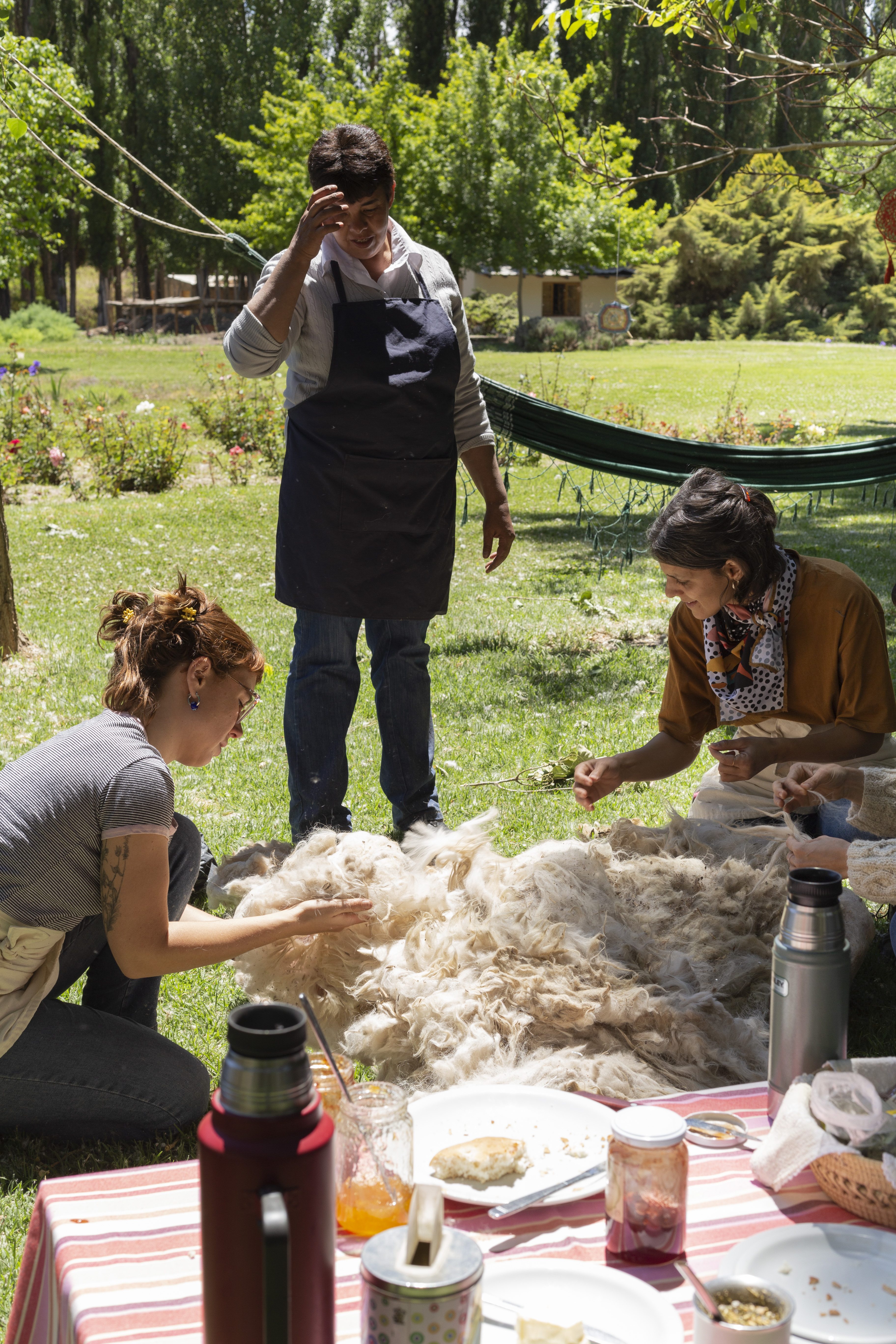 NC: Nos encontramos con muchas personas con ganas de ser parte de la Residencia desde su interés, sus aportes y entonces el grupo que conformó la experiencia creció enormemente: Eva Alvarez, maestra tejedora, yuyera y tintorera, guió en profundidad el aprendizaje de todo el grupo. Sus alumnas en la escuela de Oficios también se sumaron a compartir el hacer y mostrar sus trabajos: Cristina, Raquel, Gisela e Hilda, las maestras tejedoras Marquesa Montaño de Tudcum y Ermela Balmaceda de Villa Iglesia, junto con sus alumnas Elisa y Patricia, compartieron sus espacios de trabajo y su historia de vida entretejidas por el telar, y Prudencio Zacarías que nos hizo su pan casero y las mejores semitas de Iglesia. También nos acompañó la bióloga Carola Meglioli, que nos introdujo en la flora nativa desde la teoría y haciendo relevamiento responsable en la zona para realizar tintes naturales. Asimismo formó parte del equipo Carlos Gómez Osorio, consultor en patrimonio arqueológico que guió la expedición a los túmulos funerarios de la cultura La Aguada, canteros de cultivo y canales de riego de la cultura Punta de Barro de Angualasto así como también viviendas y corrales de la misma cultura y finalmente a los petroglifos que se encuentran en La Junta, acompañados también por el guía Nicolás Meglioli y Leticia González, geóloga que enriqueció notablemente la visita. Y Guido Altamira que nos propuso una mirada astronómica desde la perspectiva andina del cielo de Bella Vista