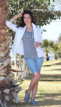 En lo que respecta a Ossira la marca está puesta en las flores y los agregados de pailletes, tachas y volados para crear chaquetas, shorts, vestidos, enteritos, camisas y chalecos.