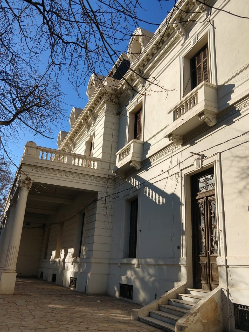 Situados ya sobre la vereda de la Avda. Rawson, se puede apreciar la majestuosidad del acceso principal, dejando al descubierto una gran cantidad de elementos que ayudan a identificarlo y asumir la jerarquía impecable lograda. Ver el Krepis o escaleras de acceso, las columnas corintias, el balcón sostenido por ménsulas, el entablamento o cornisas, el frontón y el remate, habilita un gesto de admiración.