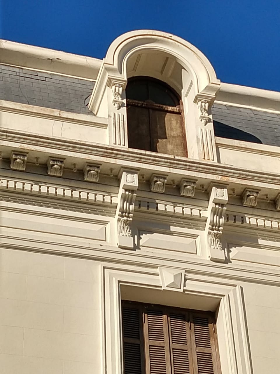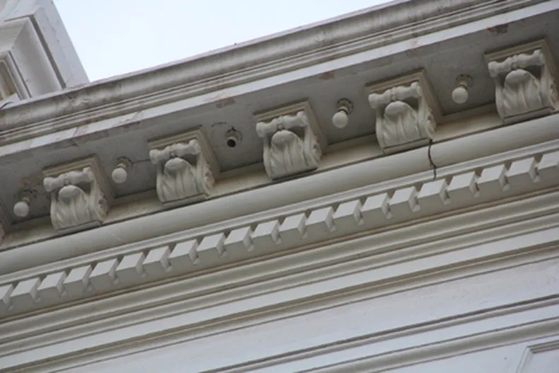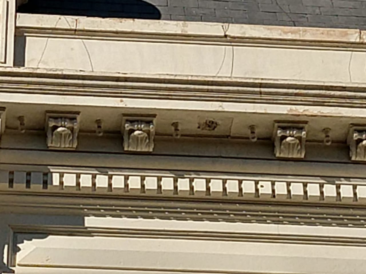 Cornisas con alto grado de deterioro. Detalle donde se observan en cornisa focos entre ménsulas. Más roturas en cornisas y ménsulas.