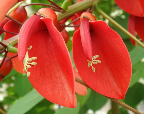 Pertenece a la familia de las leguminosas. No es un árbol muy alto y tiene un follaje caduco de intenso color verde. Sus flores son grandes y de un rojo carmín. Su tronco es retorcido. Sus raíces son sólidas y se afirman al suelo contrarrestando la erosión que provocan las aguas. Su madera es blanca amarillenta y muy blanda, se utiliza para fabricar algunos artículos de peso reducido. Sus flores se utilizan para teñir telas.