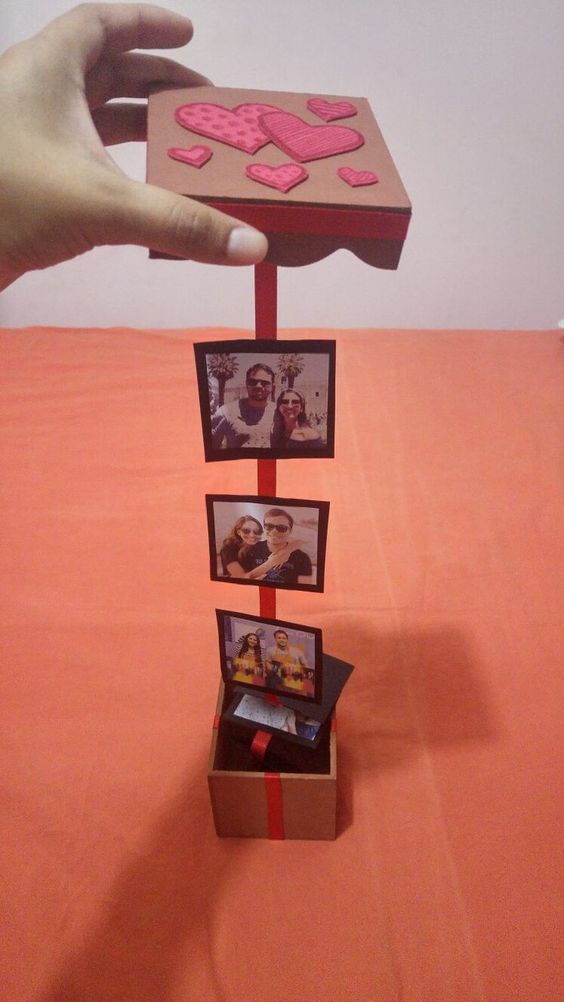 Una caja sorpresa: En una caja pequeña que puede ser de madera o cartón para decorarla, la idea es armar una tira de fotos de todos los momentos maravillosos que pasaron juntos.