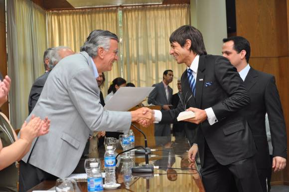 Los directivos de Automotores 20 de Junio manifestaron su orgullo al recibir la distinción de manos del gobernador de la provincia, ingeniero José Luis Gioja.