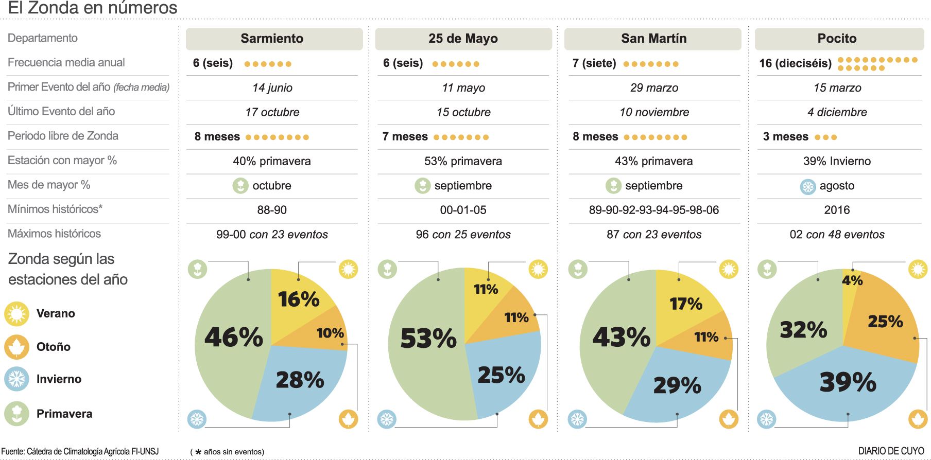 E indicó: "Se realizó un análisis de la base de datos meteorológicos de 4 departamentos del Valle de Tulum: Pocito, San Martín, 25 de Mayo y Sarmiento. La información corresponde a estaciones meteorológicas del Instituto Nacional de Tecnología Agropecuaria (INTA), ubicadas en la E.E.A. INTA Pocito, Campo anexo San Martín INTA, Escuela Agrotécnica de 25 de Mayo y Escuela Agrotécnica de Sarmiento".