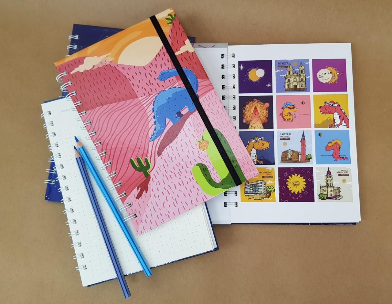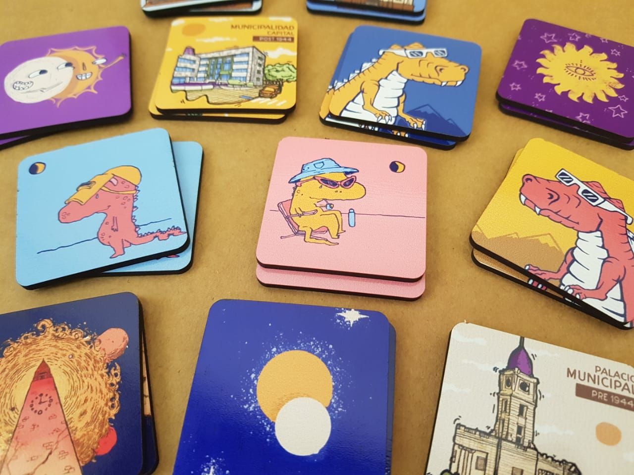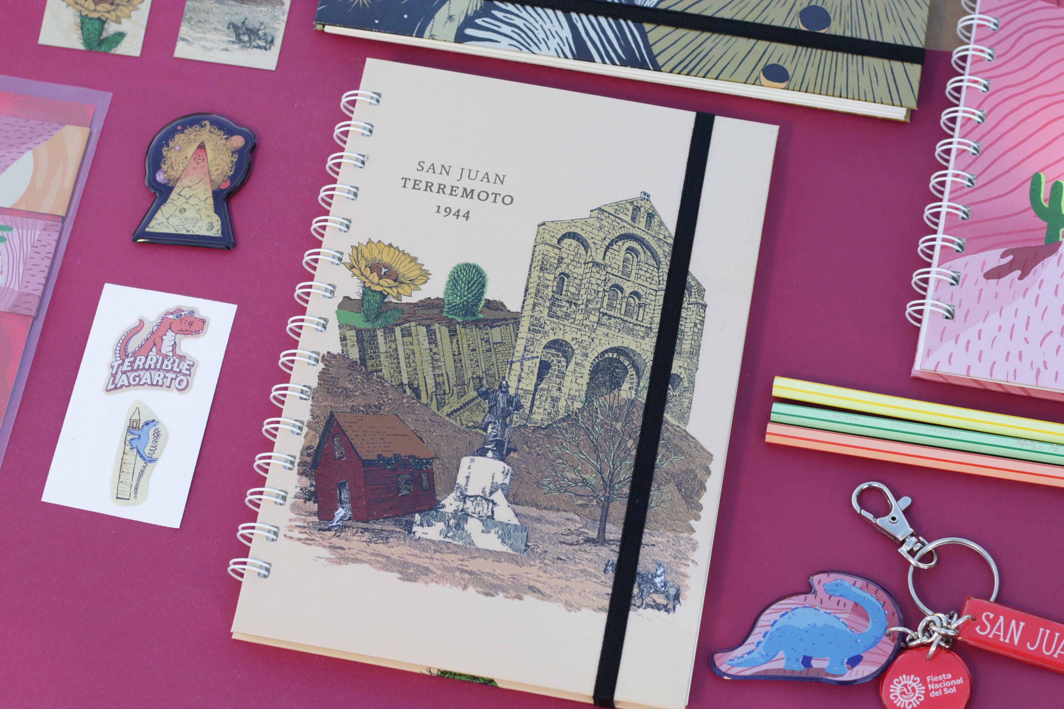 "Tenemos también algunos productos donde está todo fusionado, por ejemplo una estampa donde se ven cosas de la astronomía, como así también dinosaurios y la representación del terremoto. Para este último tema en particular se apeló a mostrar los edificios que ocupaban determinados lugares y los que están en la actualidad", agrega.