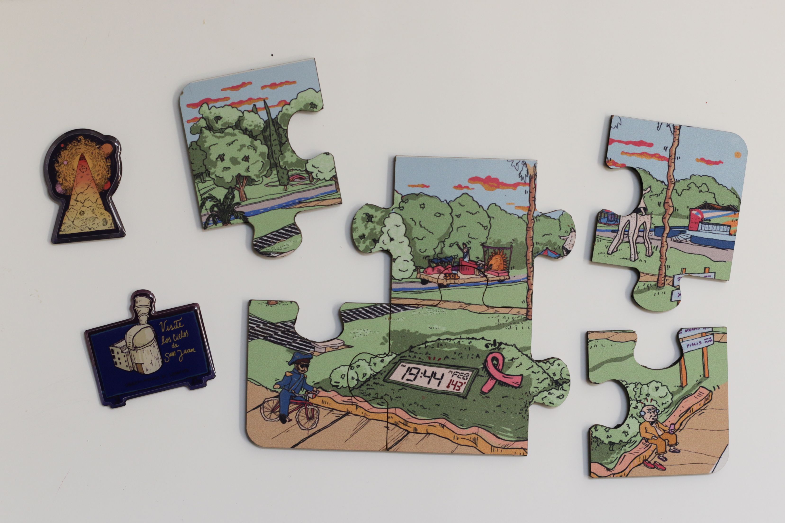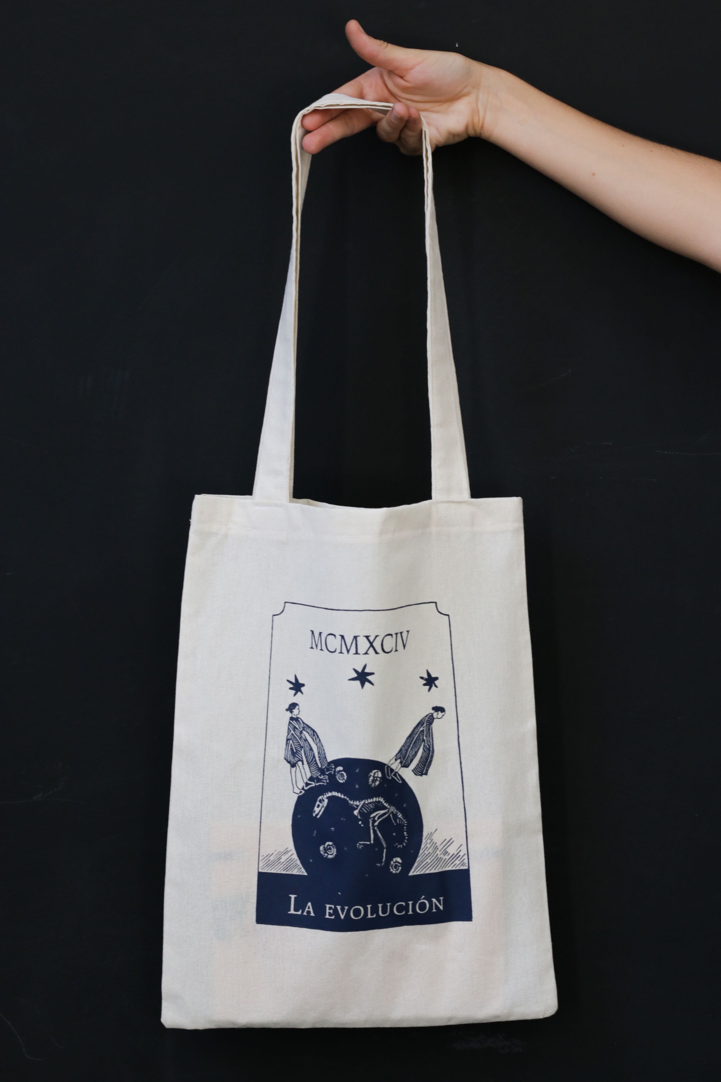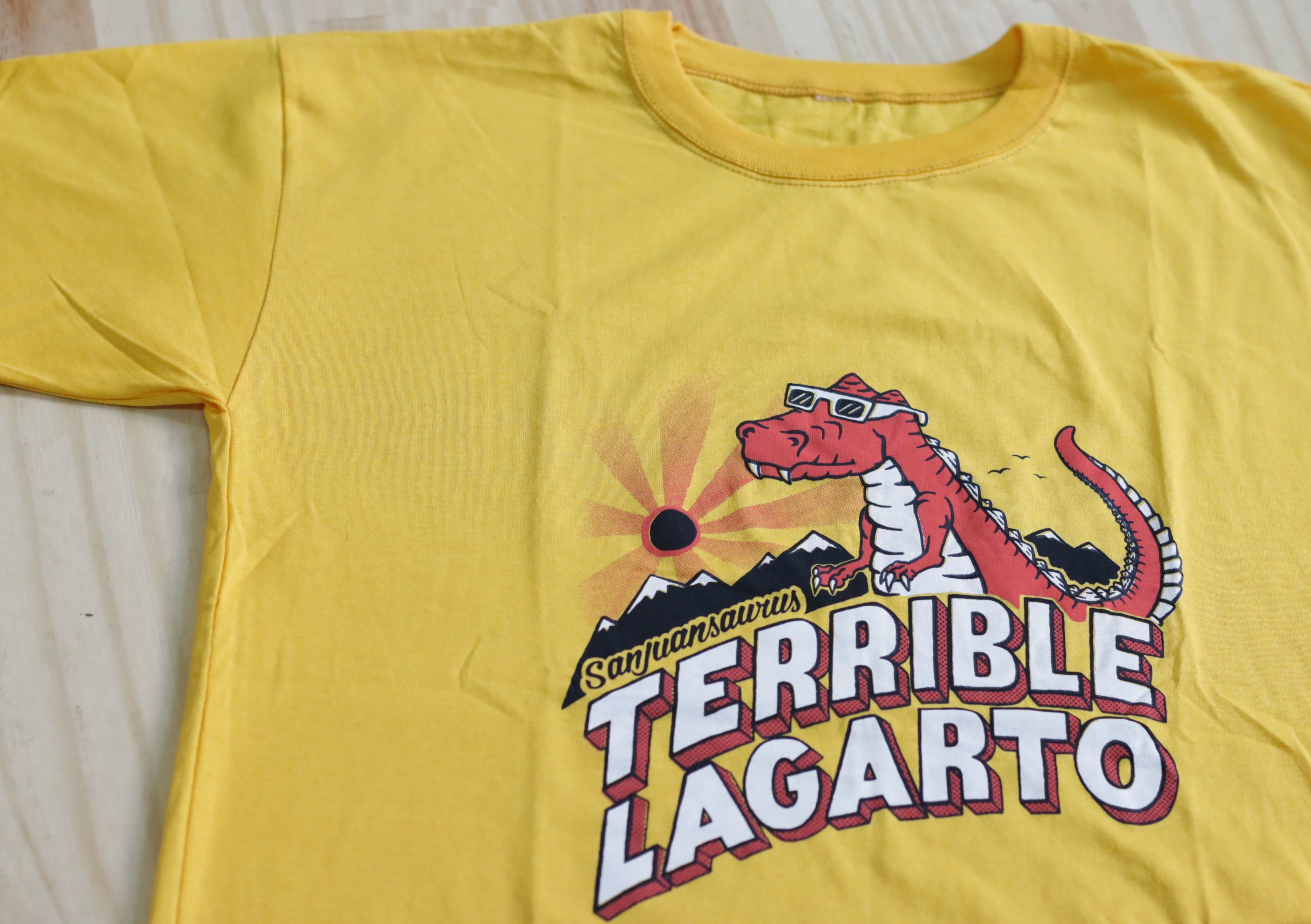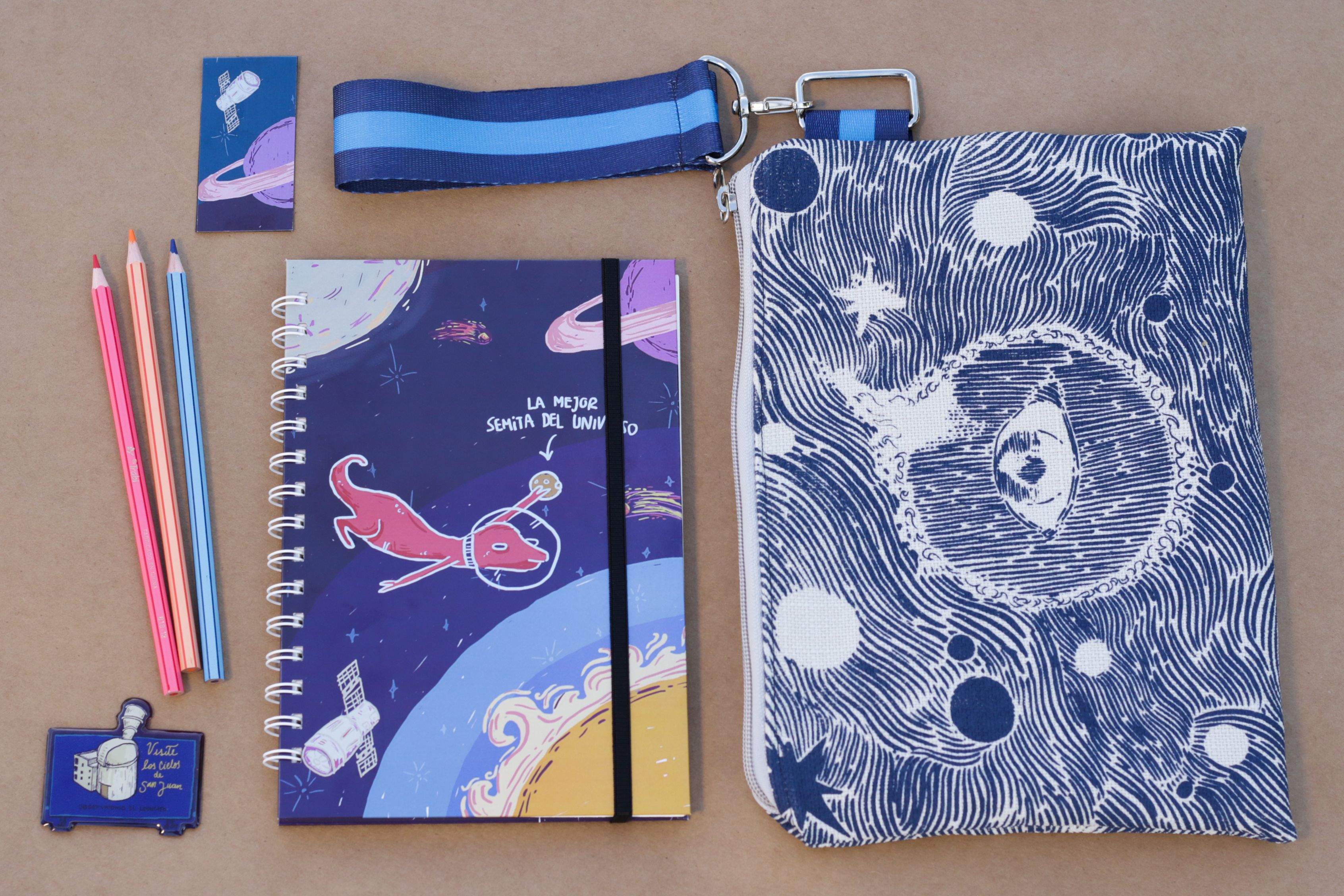 "Tenemos también algunos productos donde está todo fusionado, por ejemplo una estampa donde se ven cosas de la astronomía, como así también dinosaurios y la representación del terremoto. Para este último tema en particular se apeló a mostrar los edificios que ocupaban determinados lugares y los que están en la actualidad", agrega.