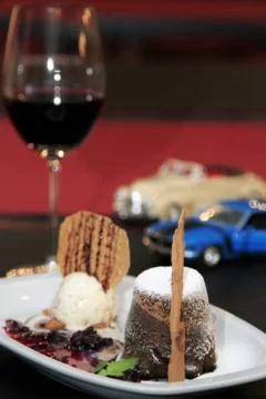 Se puede pedir desde un postre Interlagos -crepés de dulce de leche con chocolate y nueces- hasta un panini Ovalo 1 -con pechuga de pollo, lechuga, tomates desecados, queso y cebollas-, una pizza Maranello (calzone relleno con cebolla, orégano y mozzarella) ó una porción de "Papas cronometradas” (que no son otra cosa que papas fritas rústicas bañadas con salsa barbacoa).