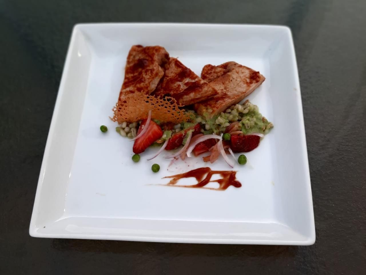 Para el chutney: saltear la cebolla cortada en juliana y cuando esté tierna agregar las frutillas, el azúcar y el vinagre y al final el merkén o ají molido. Apenas pierda consistencia la frutilla retirar del fuego y reservar. Sellar los bifecitos, pintar con la barbacoa y colocar en horno fuerte por 10 minutos. Volver a pintar y dejar 5 minutos más. Servir con la cebada verde y el chutney.
